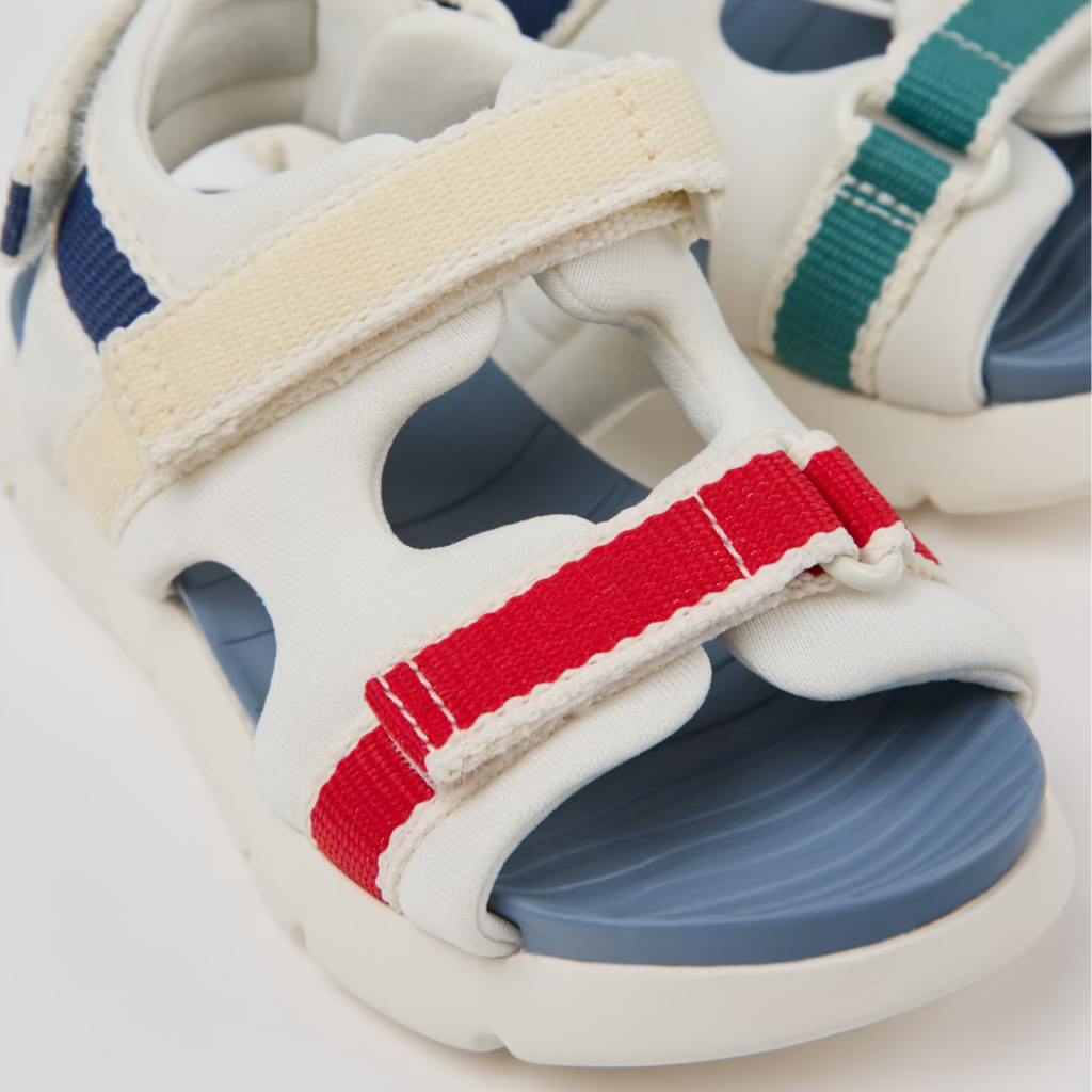 Meerkleurige textiel kindersandalen met EVA-voetbed, klittenbandsluiting en EVA-buitenzool.