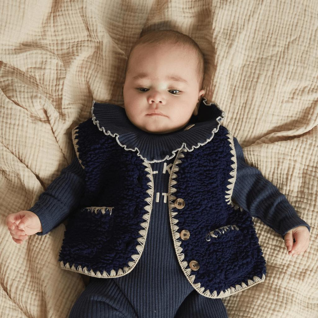 Een iconisch silhouet met een frisse folk-twist – maak kennis met het Amos Midnight Folk Gilet van Claude & Co. Deze uniseks gilet met een royale, oversized pasvorm is uitgevoerd in diepe navy-blauw (Midnight) en voorzien van speelse details zoals folk-geïnspireerd stikwerk, grote opgestikte zakken en rokerige tortoiseshell knopen.