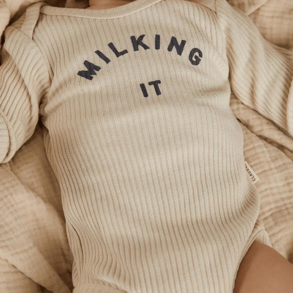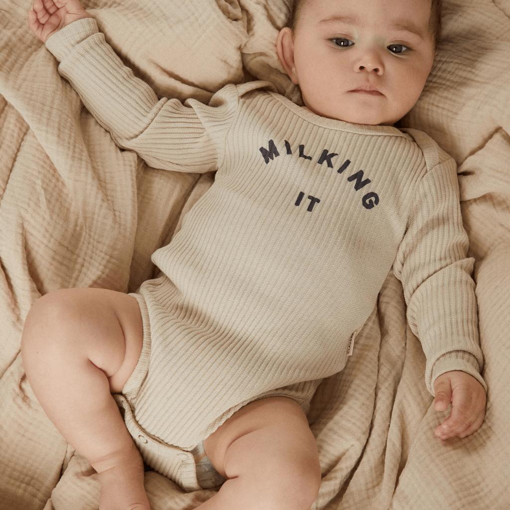 Onze iconische oat kleur nu in een handige bodyvorm, perfect voor dagelijks laagjes dragen. Gemaakt van organisch ribstof met een lichte stretch voor comfort en bewegingsvrijheid. De body is afgewerkt met een subtiele charcoal Milking It print.