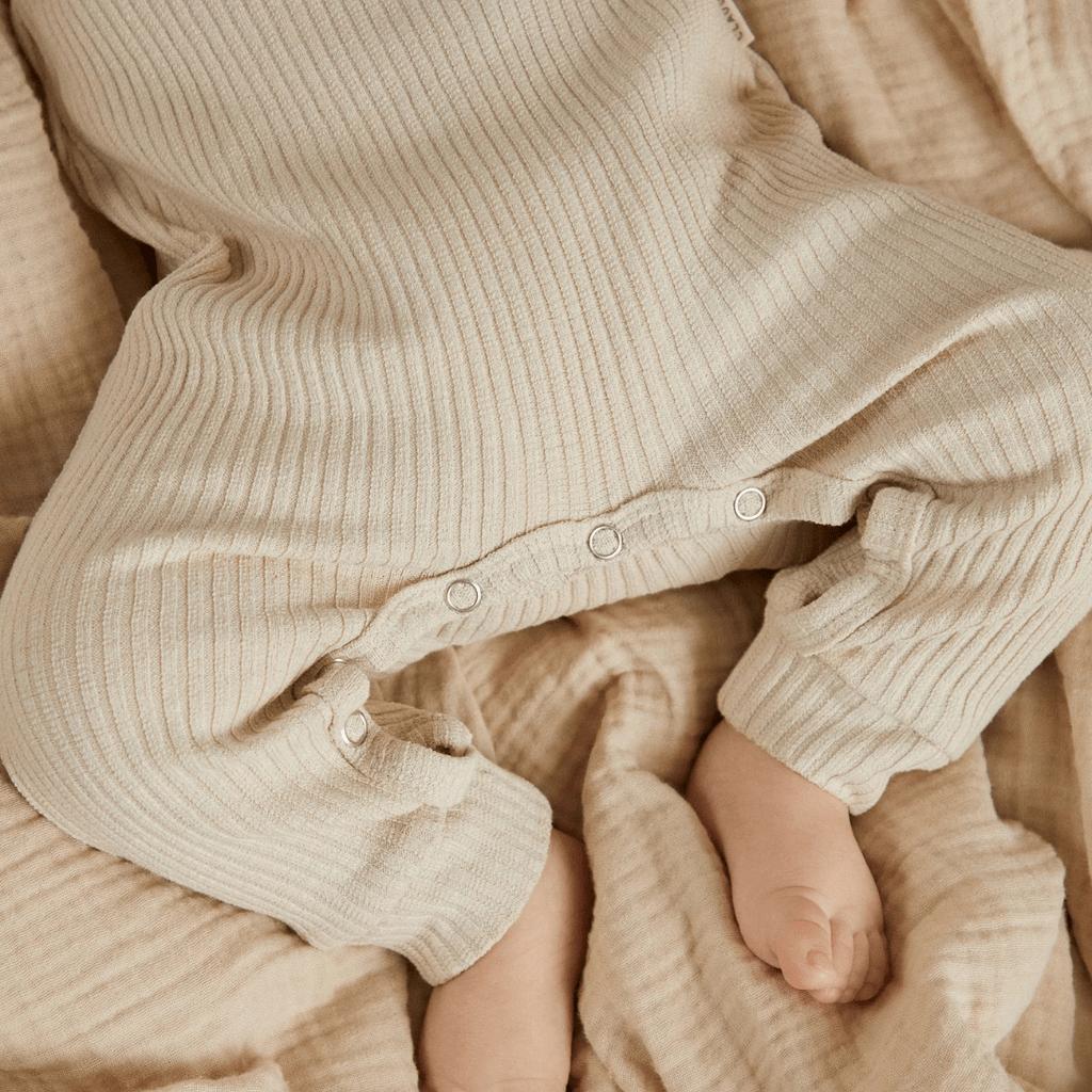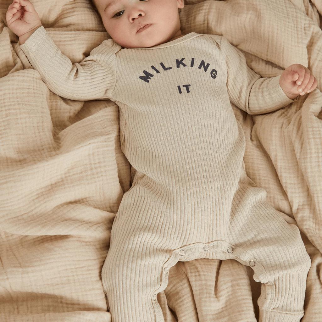 Onze iconische onesie in de populaire “Oat” kleur, een bestseller met goede reden. Gemaakt van zacht biologisch ribkatoen met een fijne stretch, afgewerkt met een subtiele crème Milking It print in watergedragen inkt.