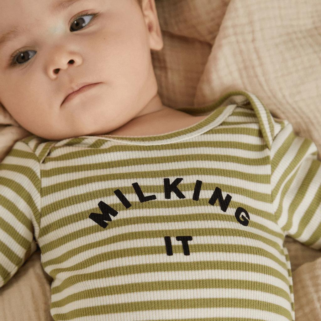 Verfrissende sage groene streep met onze kenmerkende Milking It touch. Deze romper is gemaakt van zacht biologisch ribkatoen met een goede rek en herstel, afgewerkt met een subtiele antracietkleurige Milking It print.