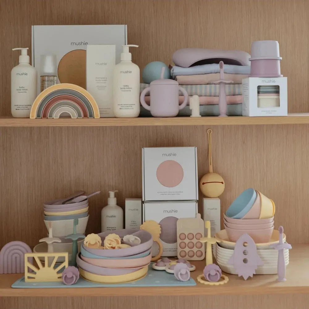 Mushie is best known for its Scandinavian designed silicone baby bibs, handmade pacifier clips, organic muslin swaddles, children's dinnerware, and toys.