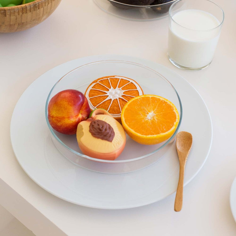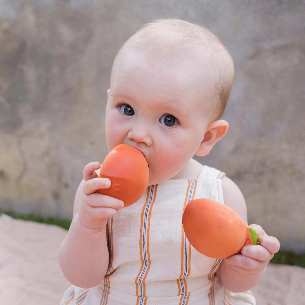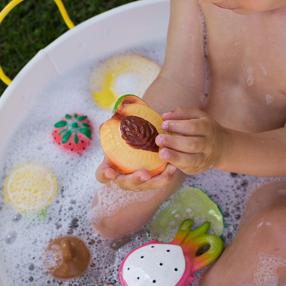 Voel je je goed? Maak kennis met Palm Peach, een bijtspeeltje en badspeeltje van natuurlijk rubber. De realistische texturen stimuleren de zintuigen van baby's en verlichten pijnlijke tandjes, waardoor het ideaal is voor zintuiglijk spel. Laat kinderen kennismaken met een gezonde levensstijl met dit fruitige bijtspeeltje!