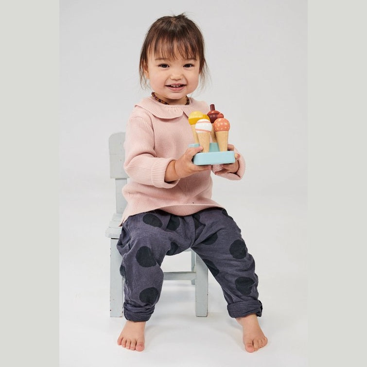 Een minishop met drie houten speelgoedhoorntjes en drie ijsschepjes, om te mixen en matchen in een rollenspel waarin je winkelt. Maak je perfecte ijshoorntje door op de rode knop te drukken en het schepje op magische wijze op het hoorntje te laten vallen!