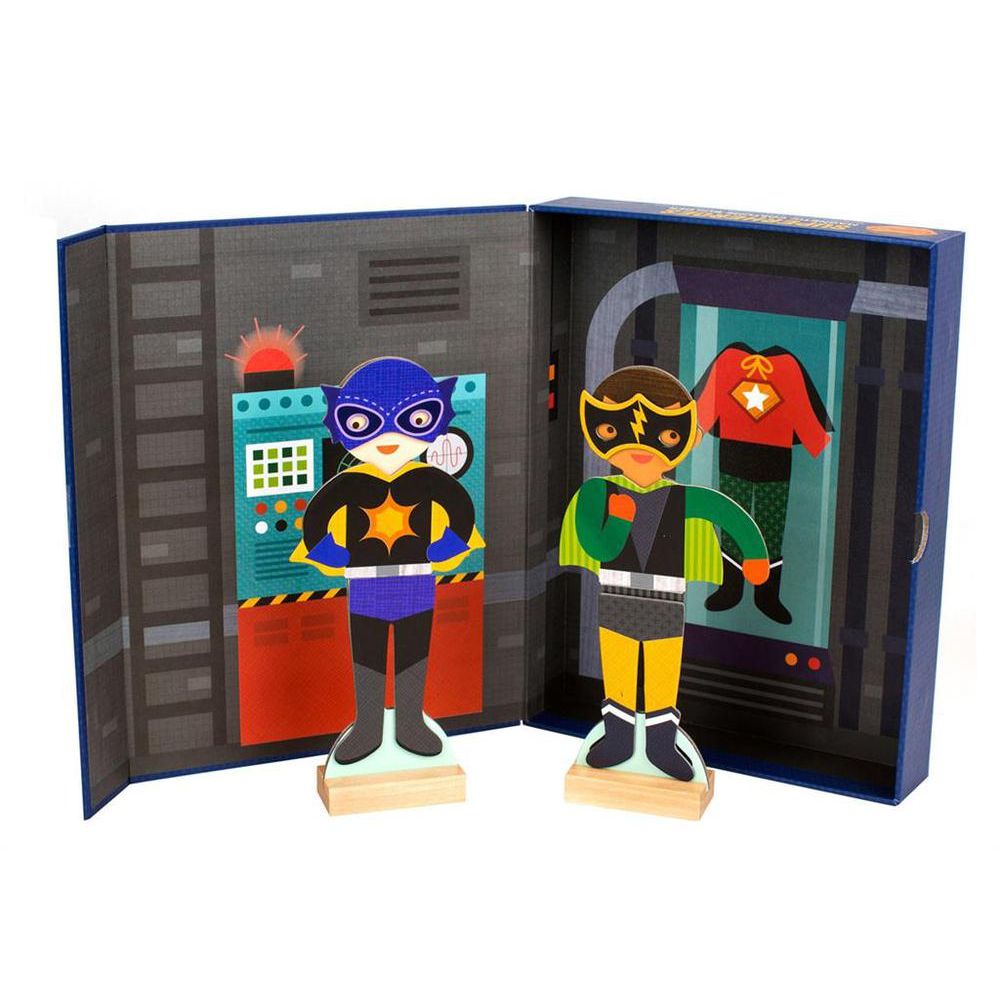 Creëer meer dan 80 verschillende heldenoutfits met dit leuke aankleedspel van Petit Collage. Help deze vrienden zich klaar te maken om de dag te redden! Kies hun kostuums en accessoires met deze magnetische verkleedset boordevol helden, inclusief twee magnetische figuren, twee houten standaards, 27 magnetische stukken en een geheime schuilplaats. Opbergdoos kan ook gebruikt worden als speel- en uitstalraam.