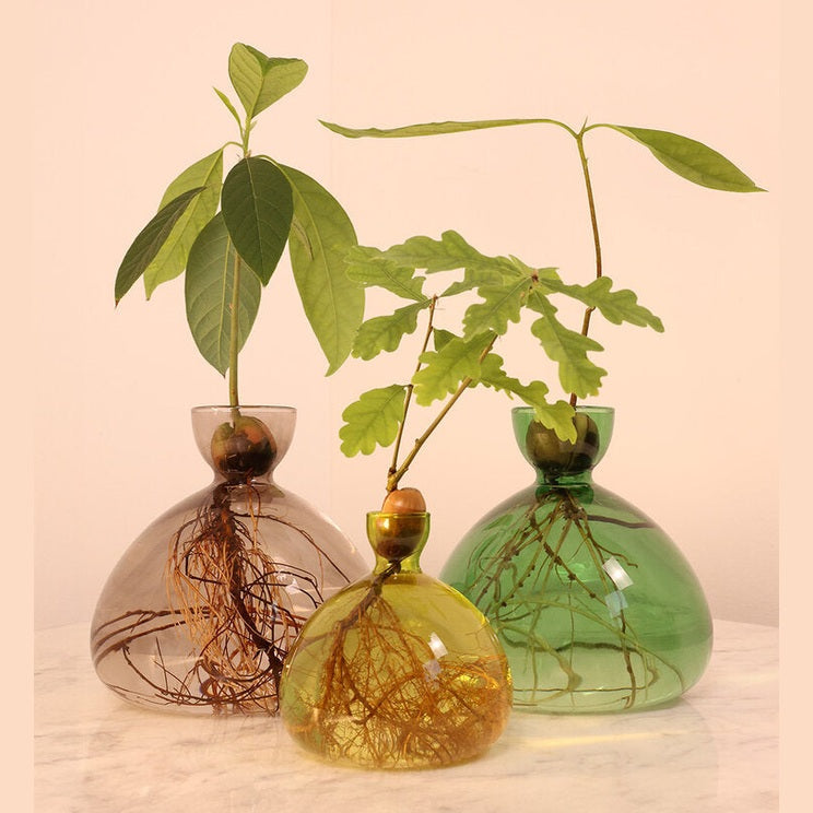 We hebben de traditionele kweekmethode verfijnd door de tandenstokers over te slaan en de opening te gebruiken om de pit te koesteren, zodat deze droog blijft tijdens het ontkiemen en de wortels vrij kunnen groeien. De golvende vaas vergroot de wortels terwijl ze bloeien; een perfect middelpunt om de plant te zien groeien.