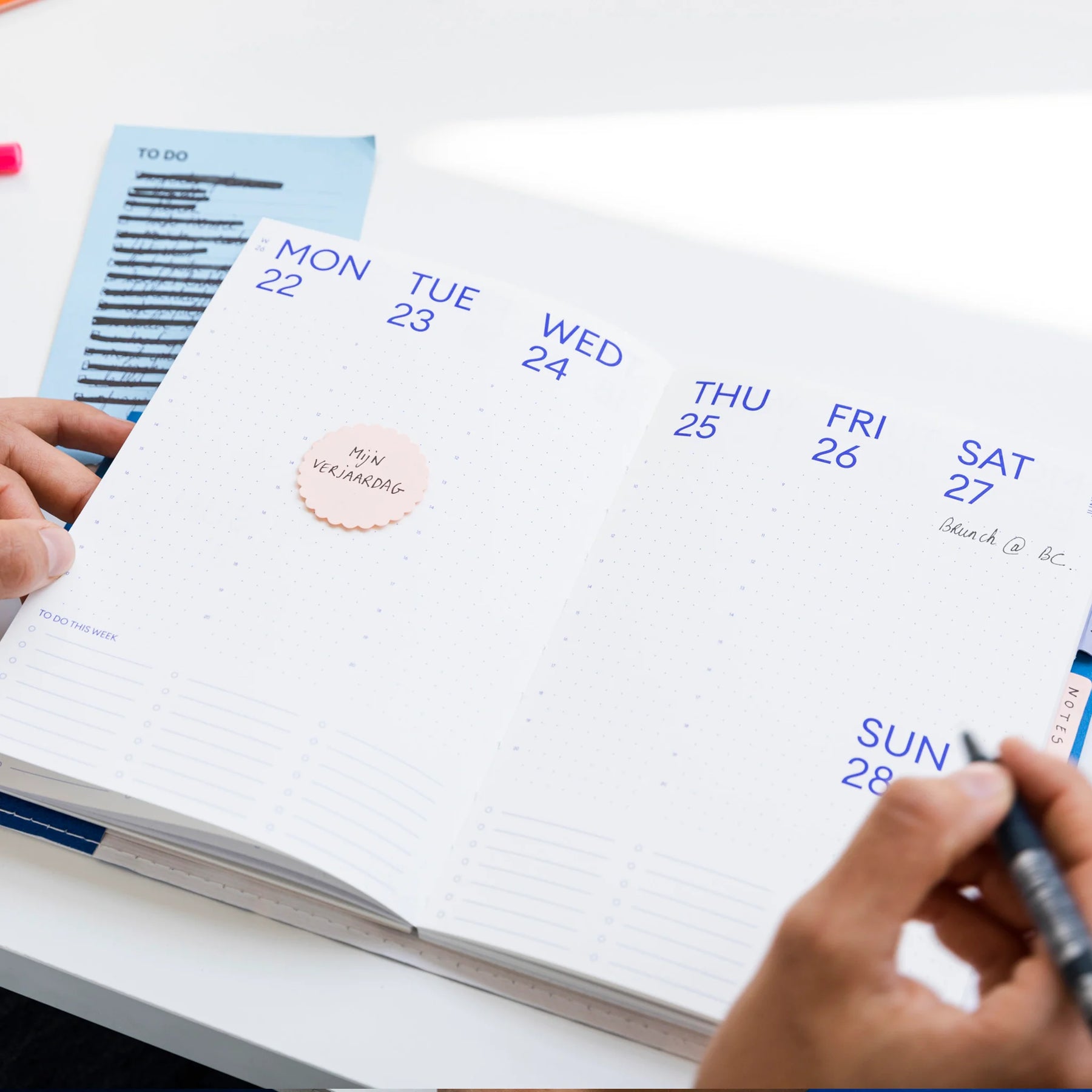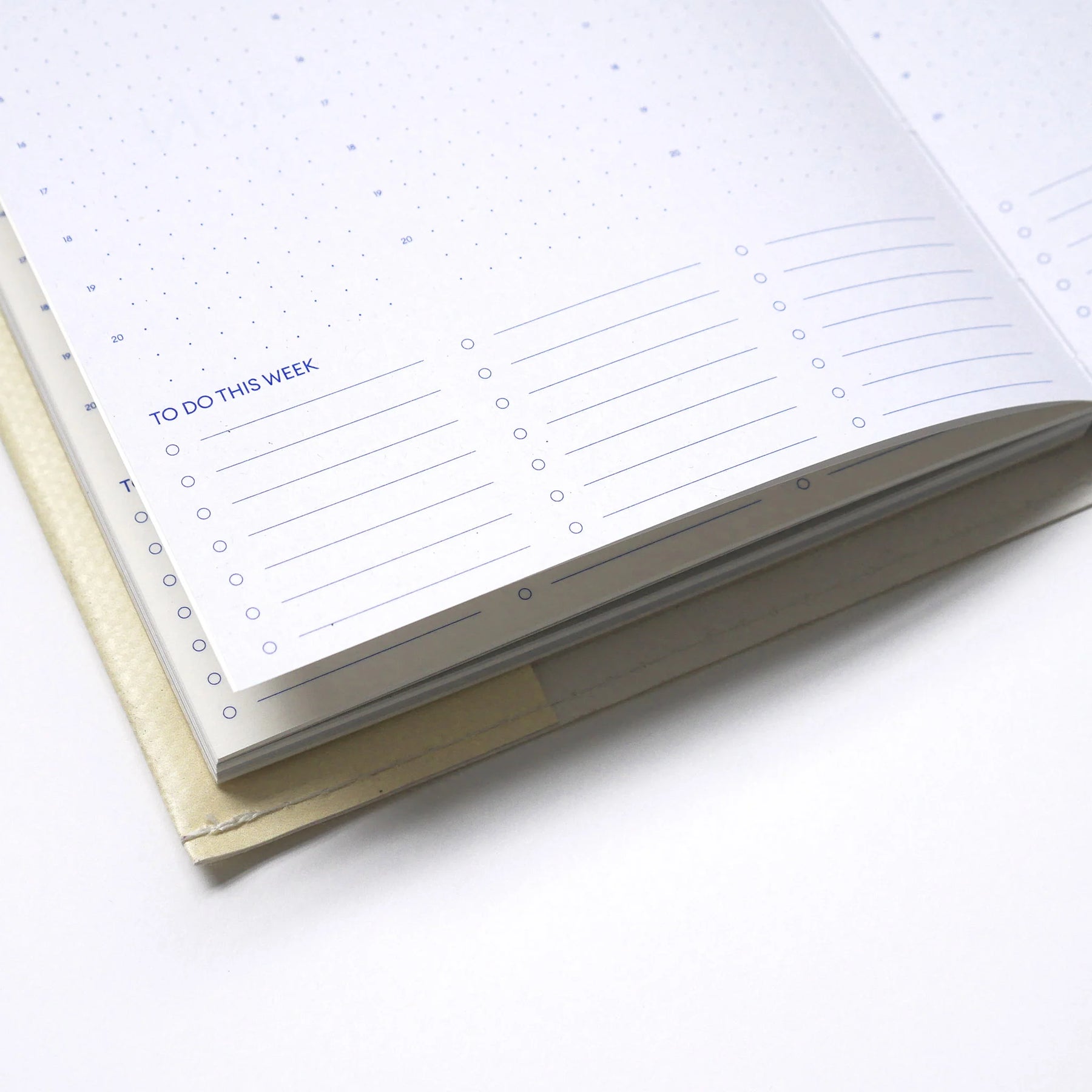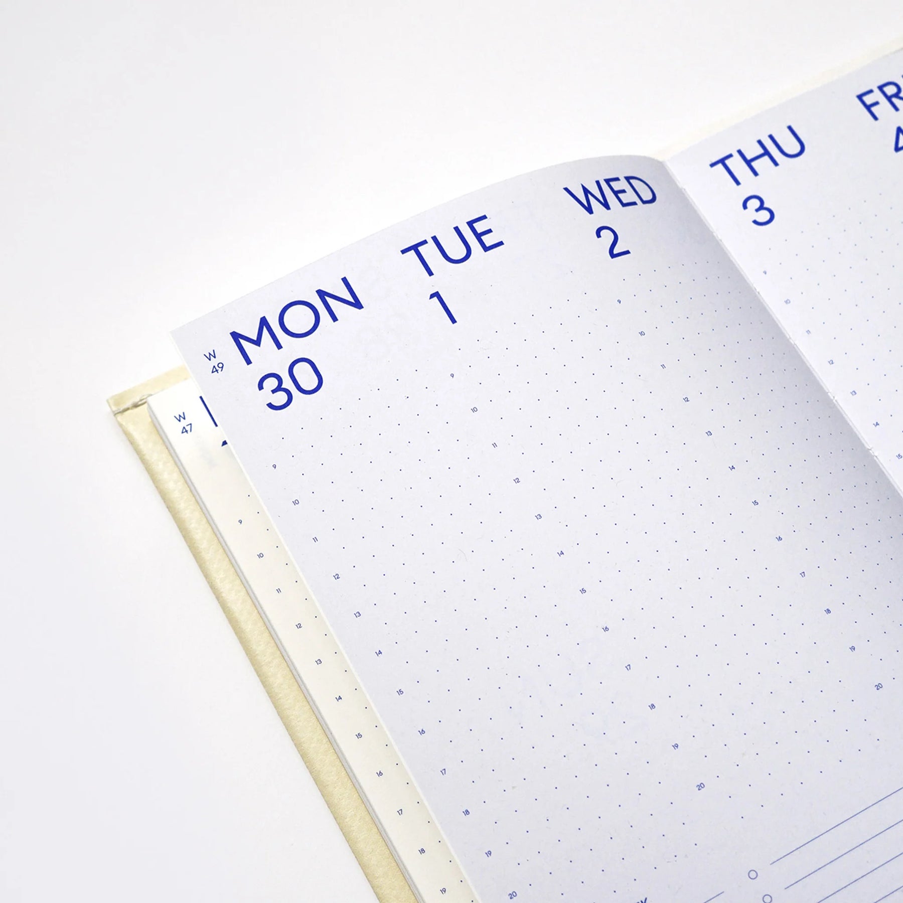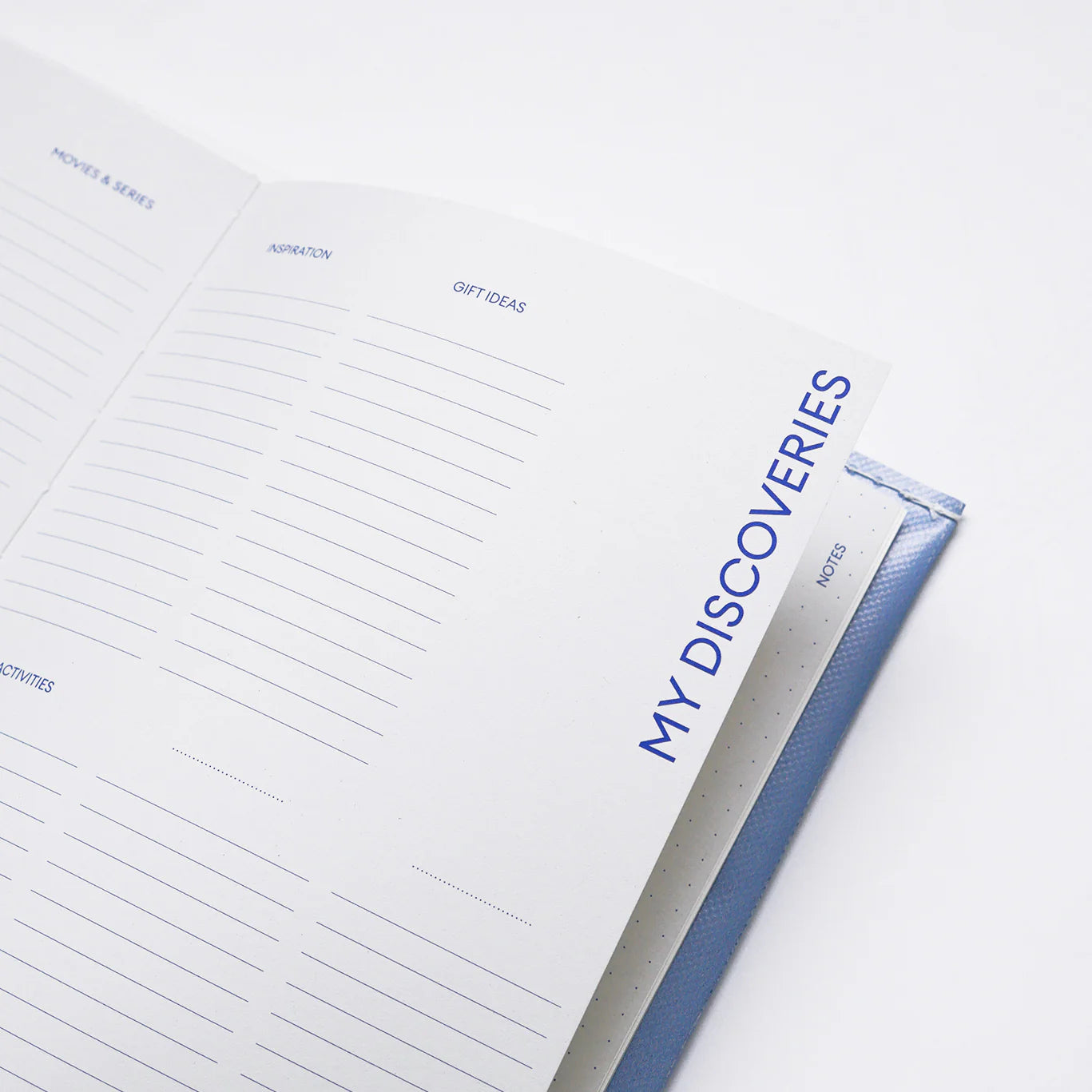 144 pagina’s - 14 x 20 cm (l x b) - Inclusief Week, Maand en Jaaroverzichten + Notities - Koptische binding - Geprint in Pantone Blue 072U - Papiergewicht: mix van 100-120 gsm – Totaal gewicht: +/- 330 g – Herbruikbare cover van upcycled banners