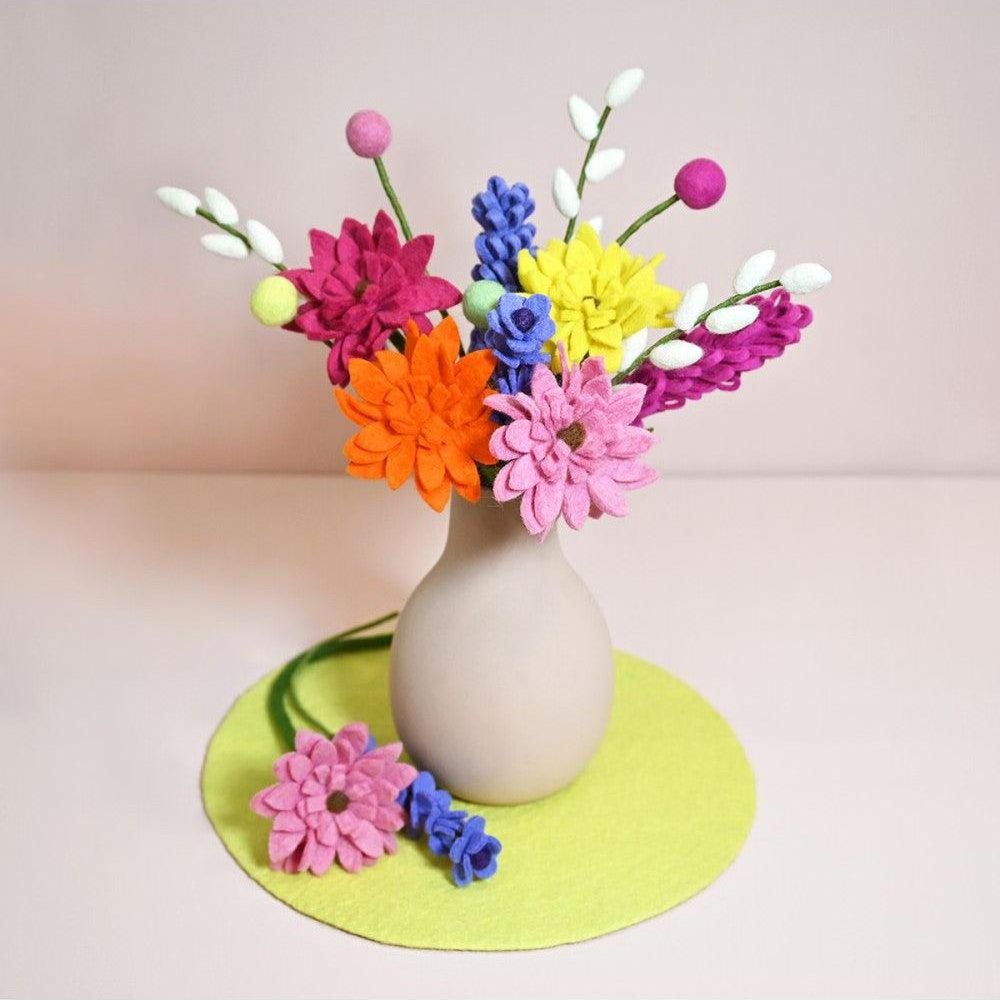 Lavendel van vilt. In de stengel is metaaldraad verwerkt zodat de tak in vorm gebogen kan worden indien gewenst. Erg leuk in een vaas!