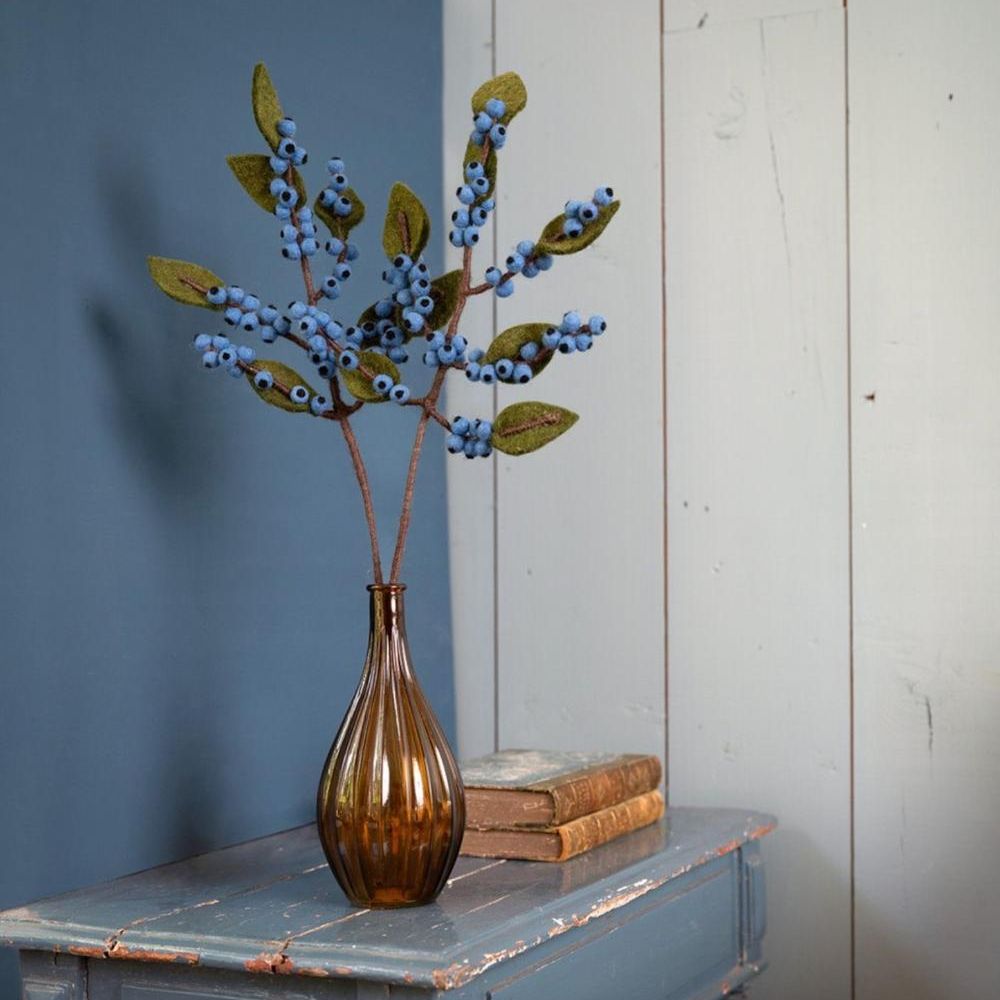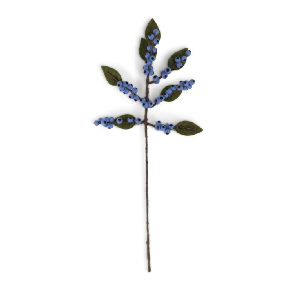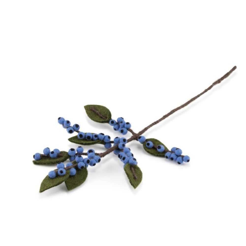 Tak bes blauw van vilt. In de stengel is metaaldraad verwerkt zodat de tak in vorm gebogen kan worden indien gewenst. Erg leuk in een vaas!