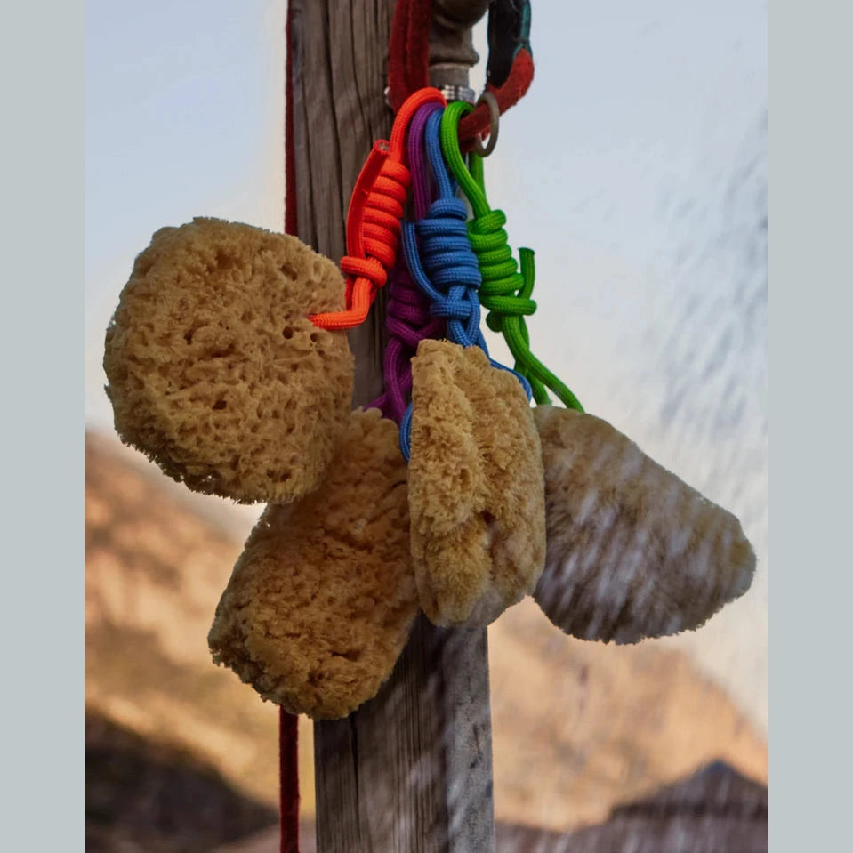 De natuurspons hangt aan een handig koord in een felle kleur. Het koord wordt in Nederland gemaakt van gerecycled PET.