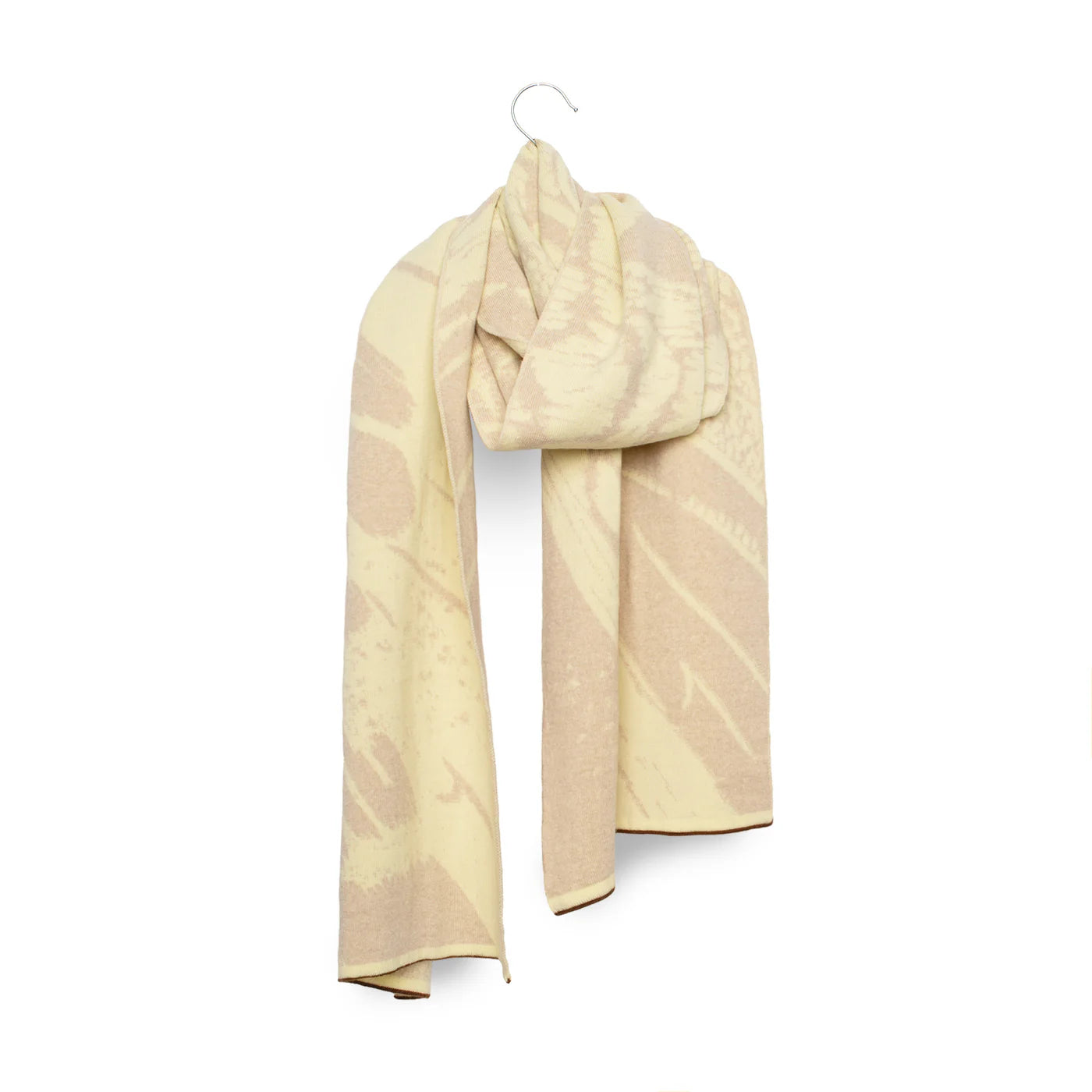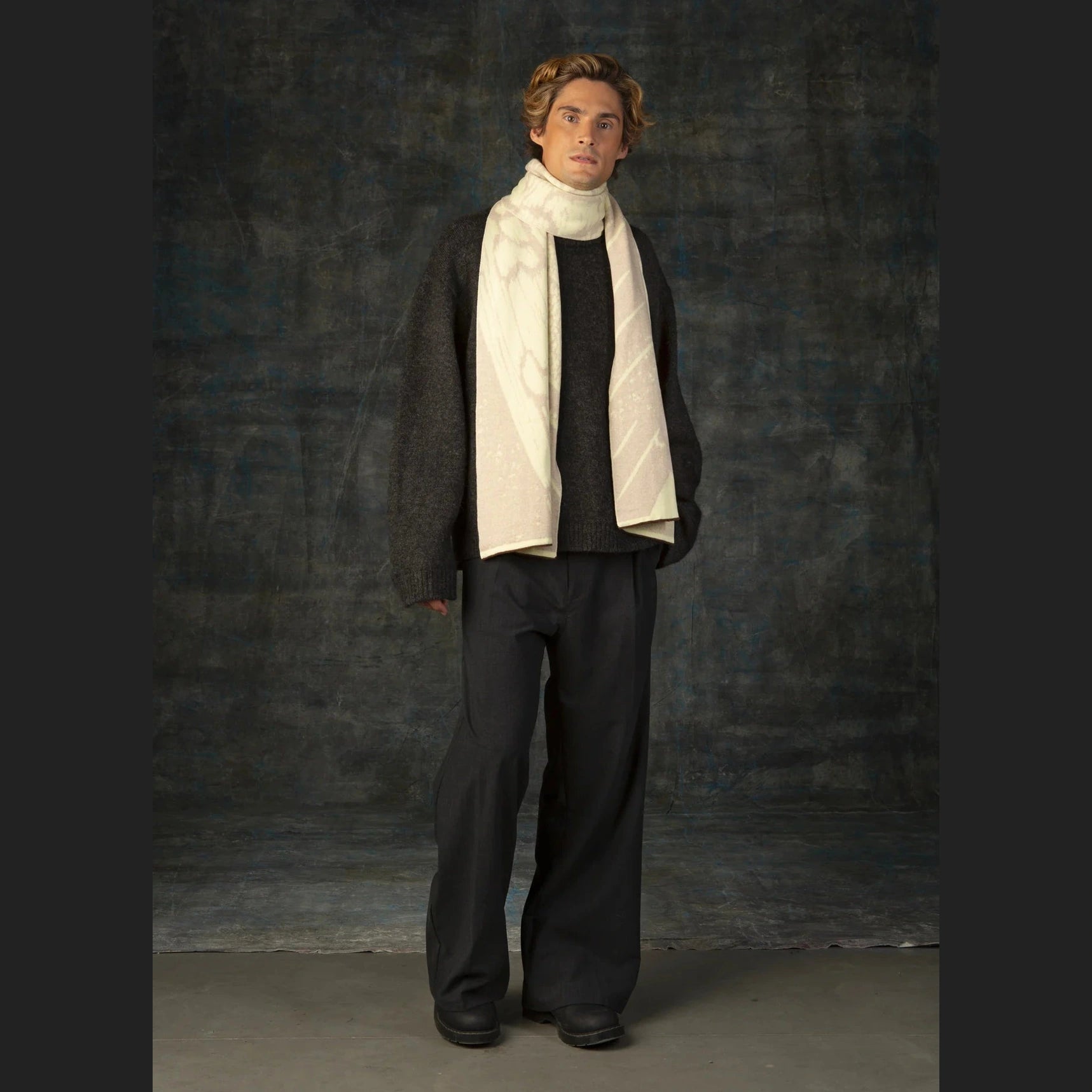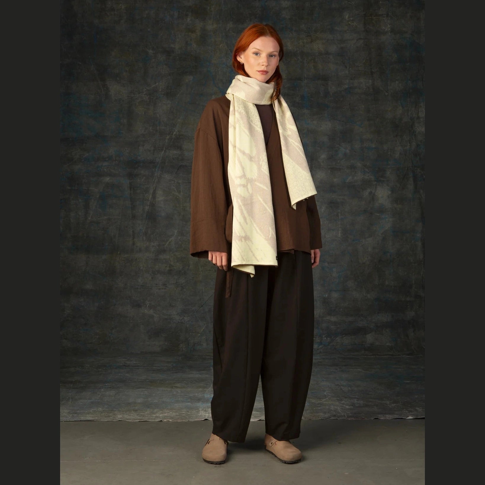 AURATA is een zachte jacquard gebreide sjaal, gemaakt in België uit 100% extra fijne merinowol. Het ontwerp, geïnspireerd op nachtvlindervleugels, is aan beide zijden zichtbaar, waardoor je de sjaal op twee manieren kan dragen.