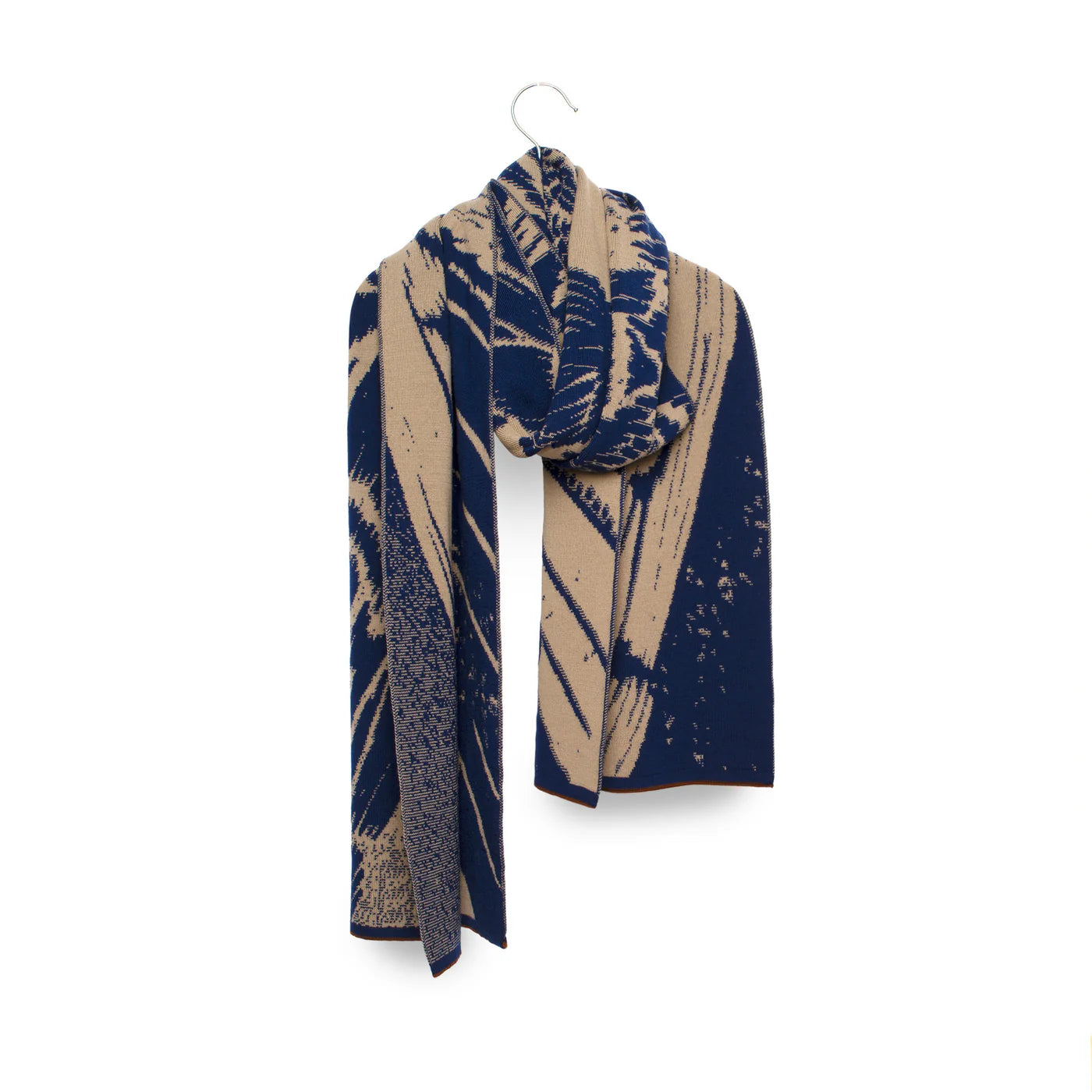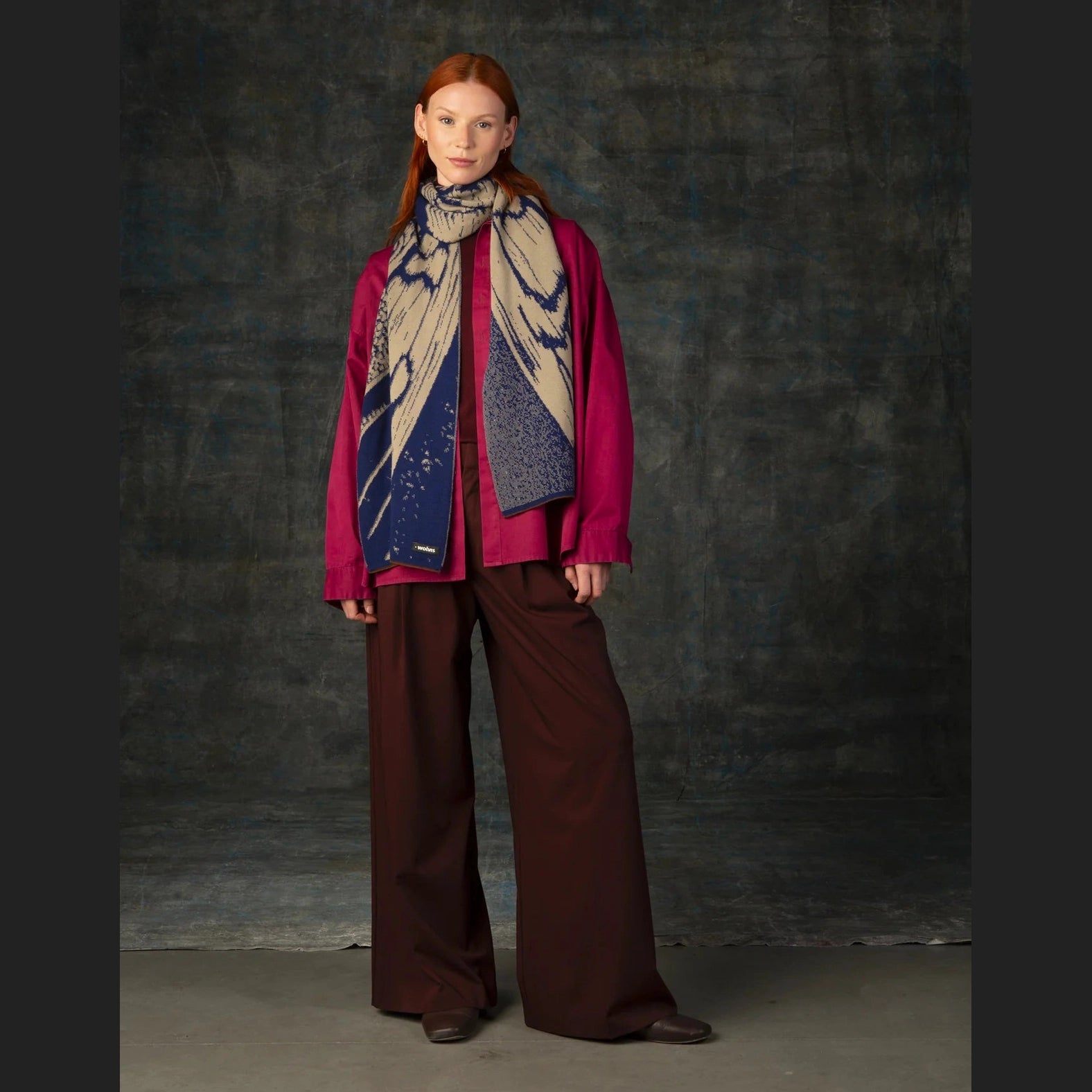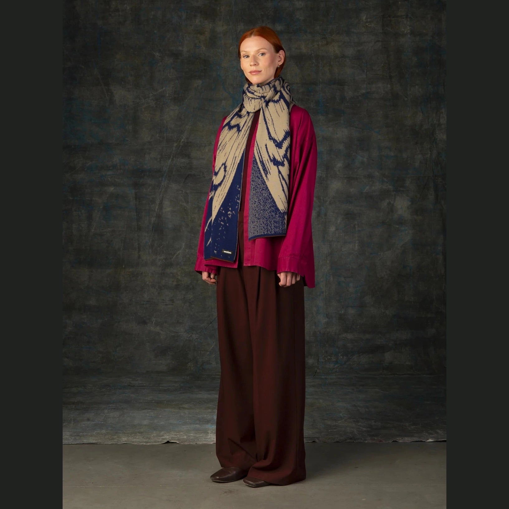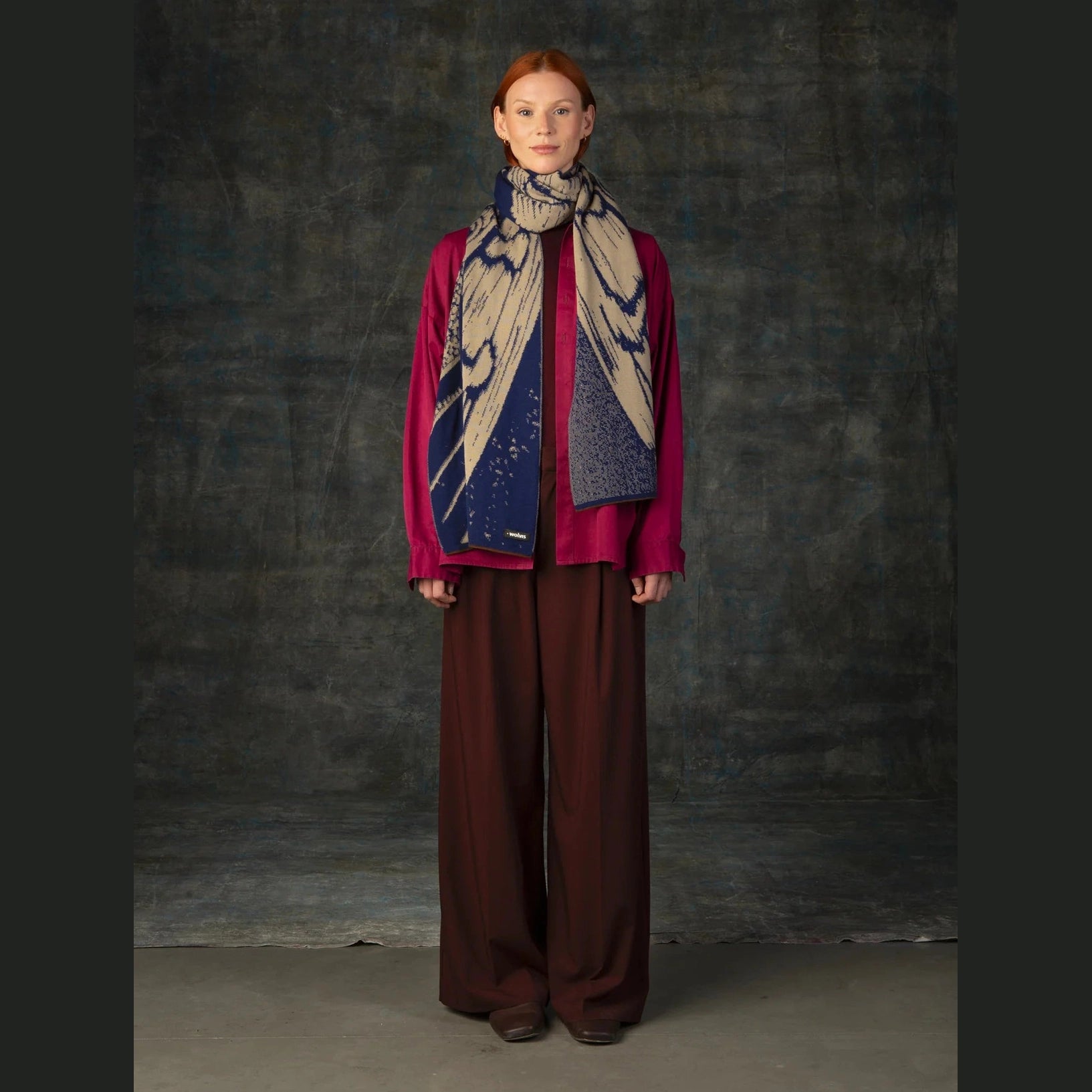AURATA is een zachte jacquard gebreide sjaal, gemaakt in België uit 100% extra fijne merinowol. Het ontwerp, geïnspireerd op nachtvlindervleugels, is aan beide zijden zichtbaar, waardoor je de sjaal op twee manieren kan dragen.