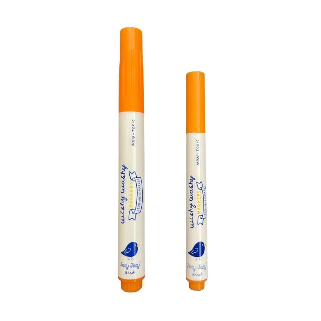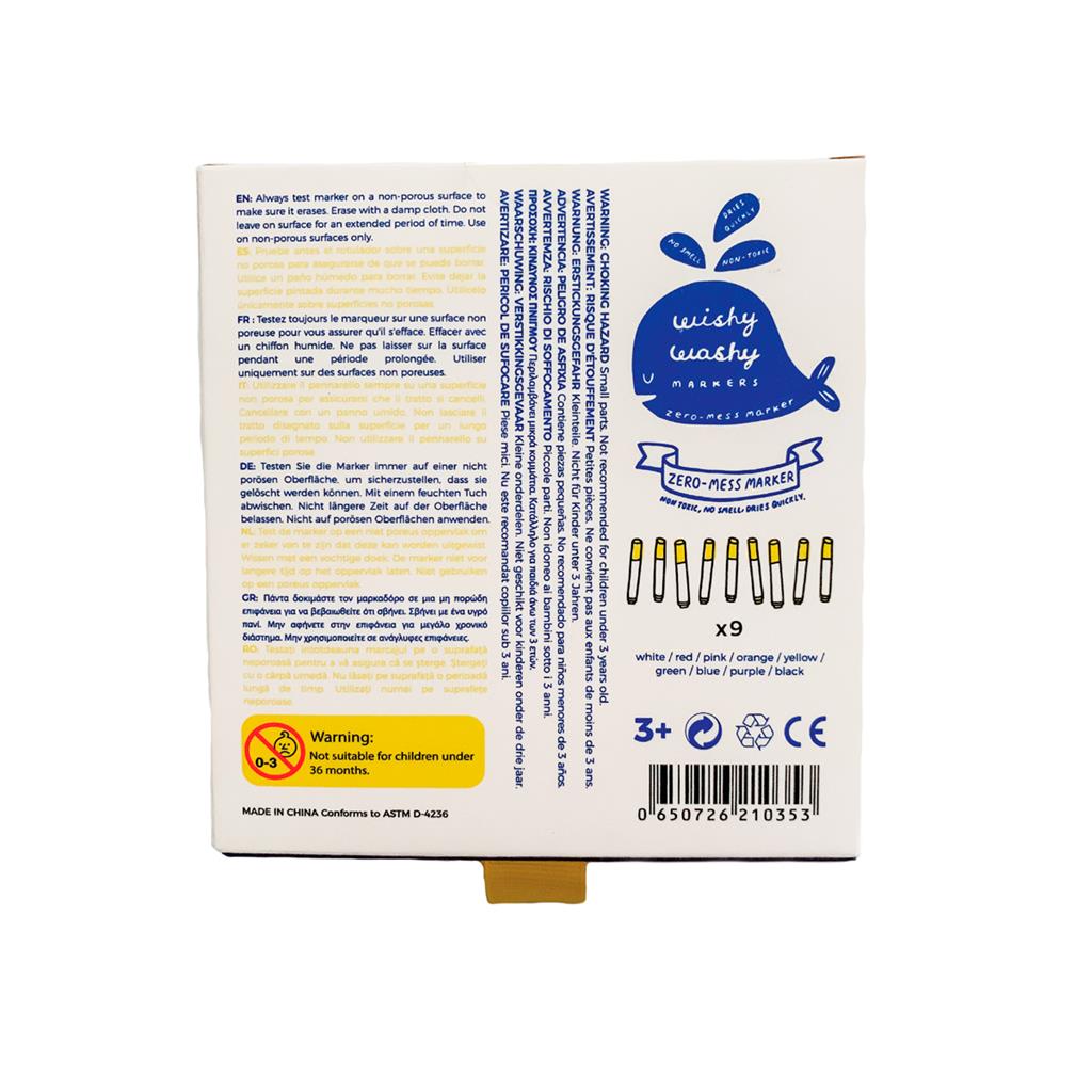 Uitwasbare droog wis- en raammarkers 9 stuks Wij hebben Wishy Washy Markers gemaakt, omdat creatieve kinderen niet hoeven te beslissen! Wishy Washy Markers zijn niet giftig en veilig voor kinderen. Wishy Washy Markers kunnen worden aangebracht en verwijderd op alle Jaq Jaq Bird® producten en de meeste niet-poreuze oppervlakken zoals muren, glas, bekers en meer. Gewoon schoonvegen met een vochtige doek om te wissen.