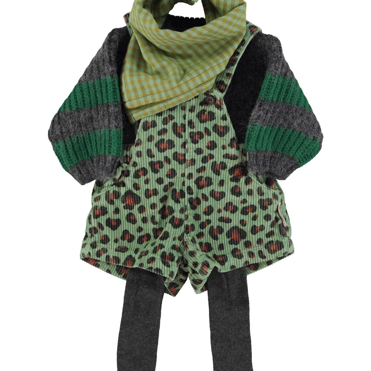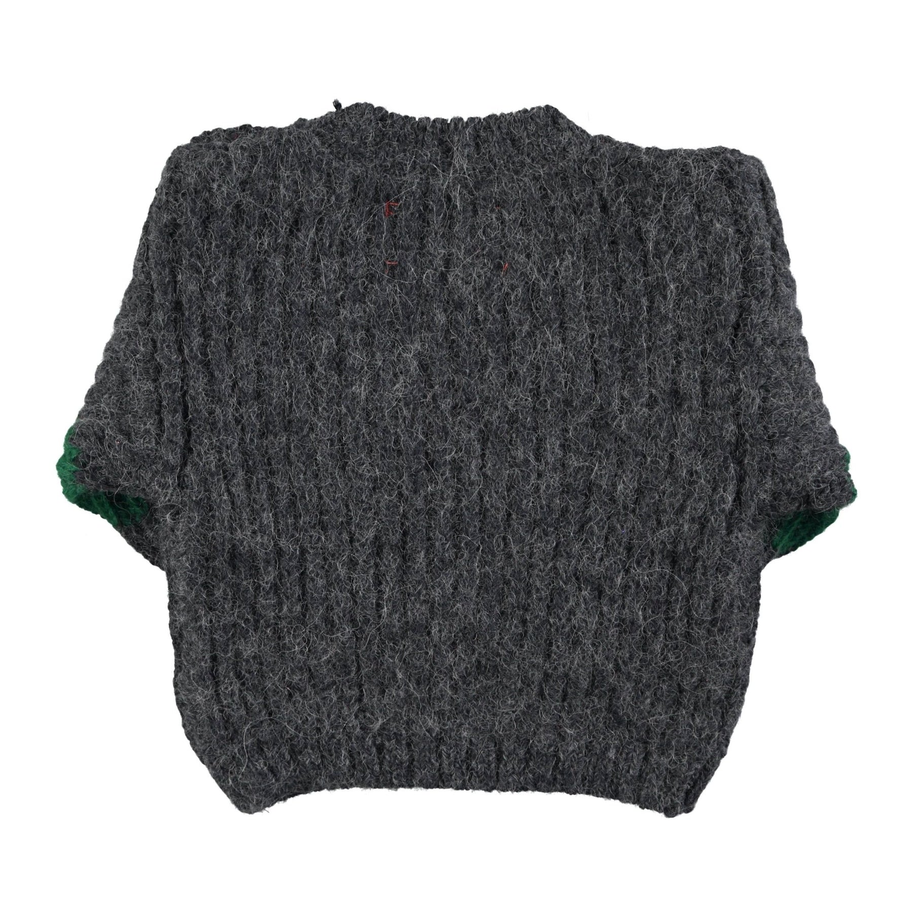 Gebreide trui met grijze en groene strepen gedetailleerd met leren logolabel. Babymaten hebben knopen op de schouder.