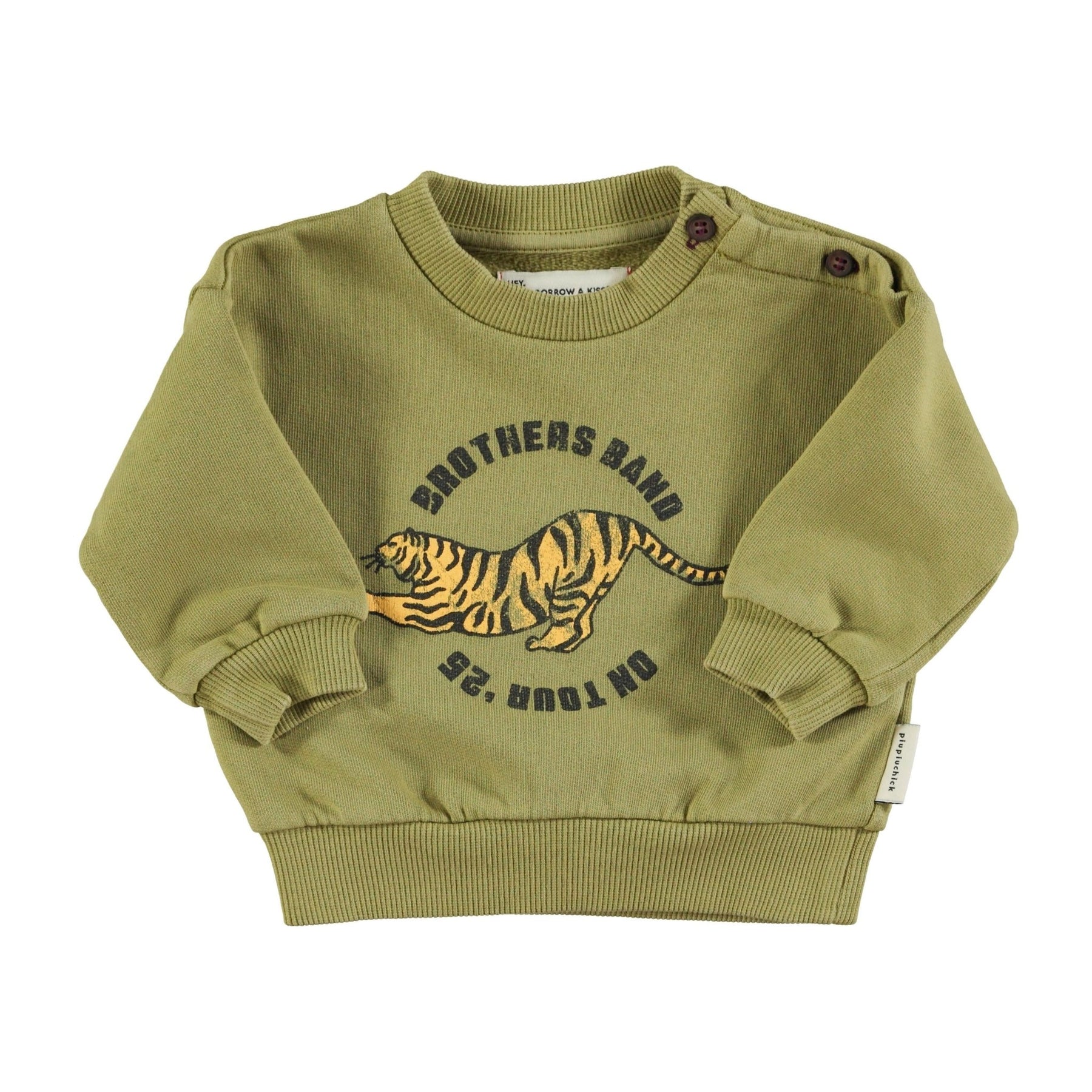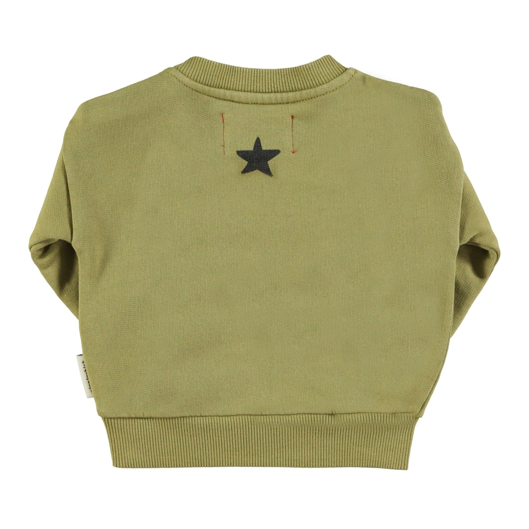Uniseks sweatshirt met print op de voorkant en een kleine zwarte ster op de achterkant. Gekaard biologisch katoenen fleece. Ribboorden. Babymaten hebben knopen op de schouders.