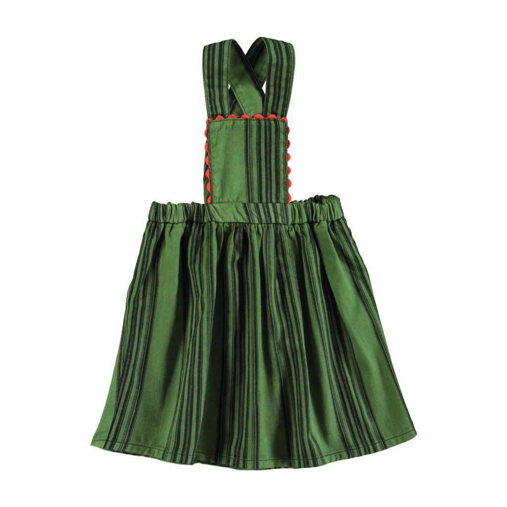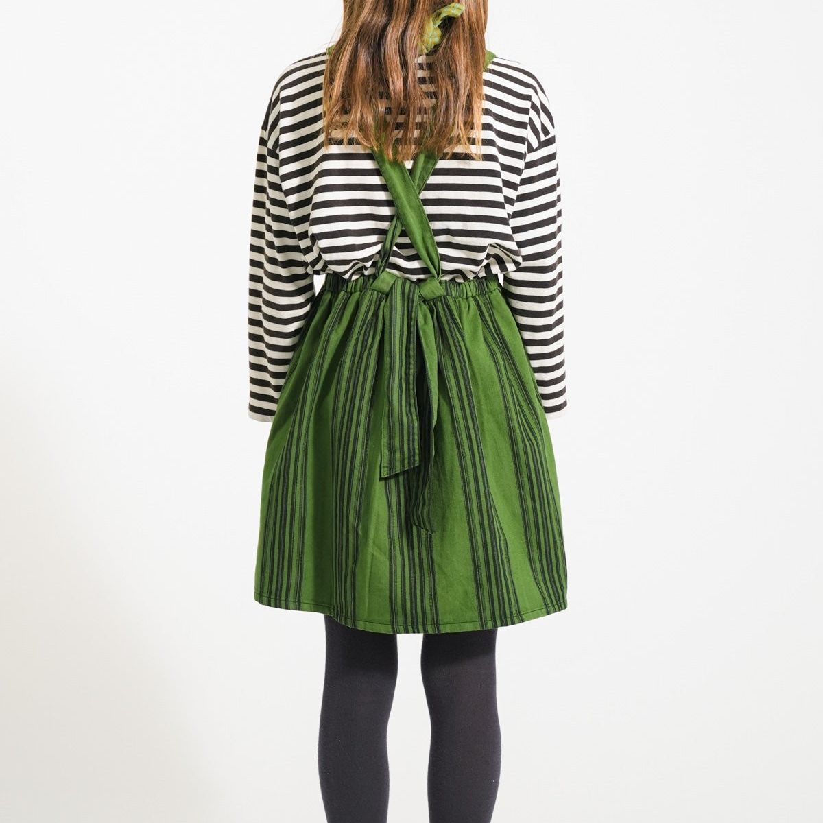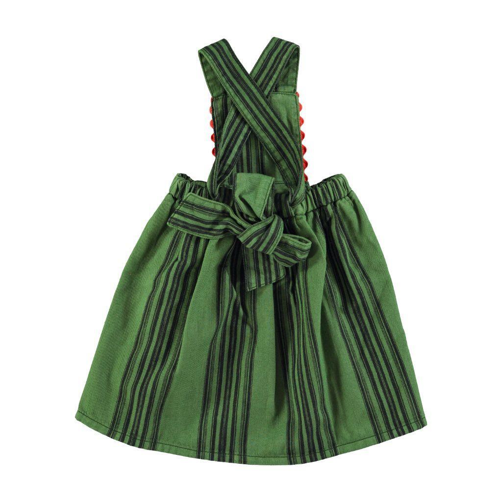 Korte jurk van katoenen canvas met gekruiste bandjes die verstelbaar zijn met een strik/knoop. Gedetailleerd met oranje spike op de borst.