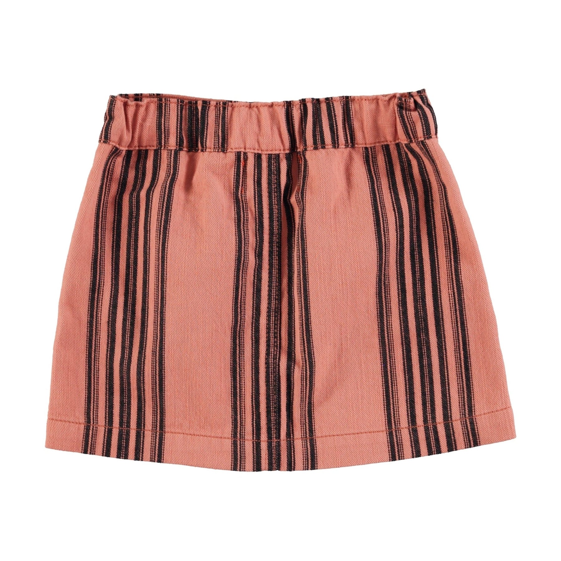 Korte rok met knopen aan de voorkant. Opgestikte zakken met geborduurd bordeaux logo en afgewerkt met oranje kanten rand. Elastische en verstelbare taille.