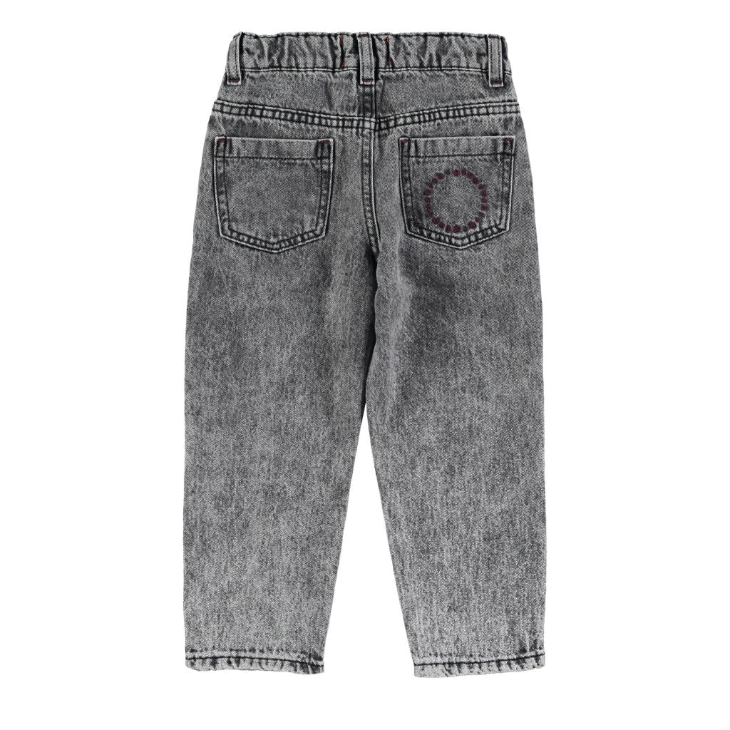 Unisex denim broek met verstelbare taille. Gedetailleerd met bordeaux logoborduursel in één achterzak.