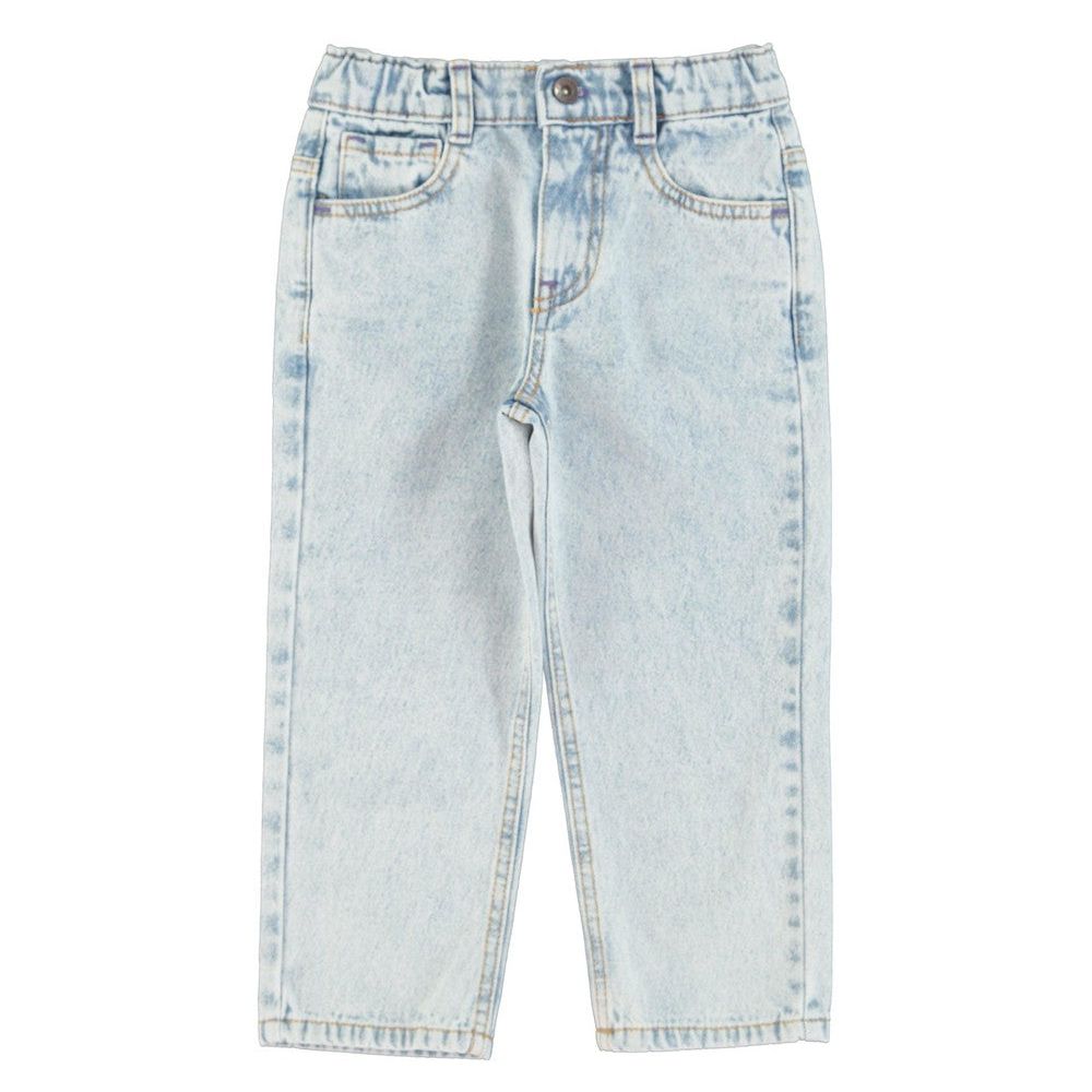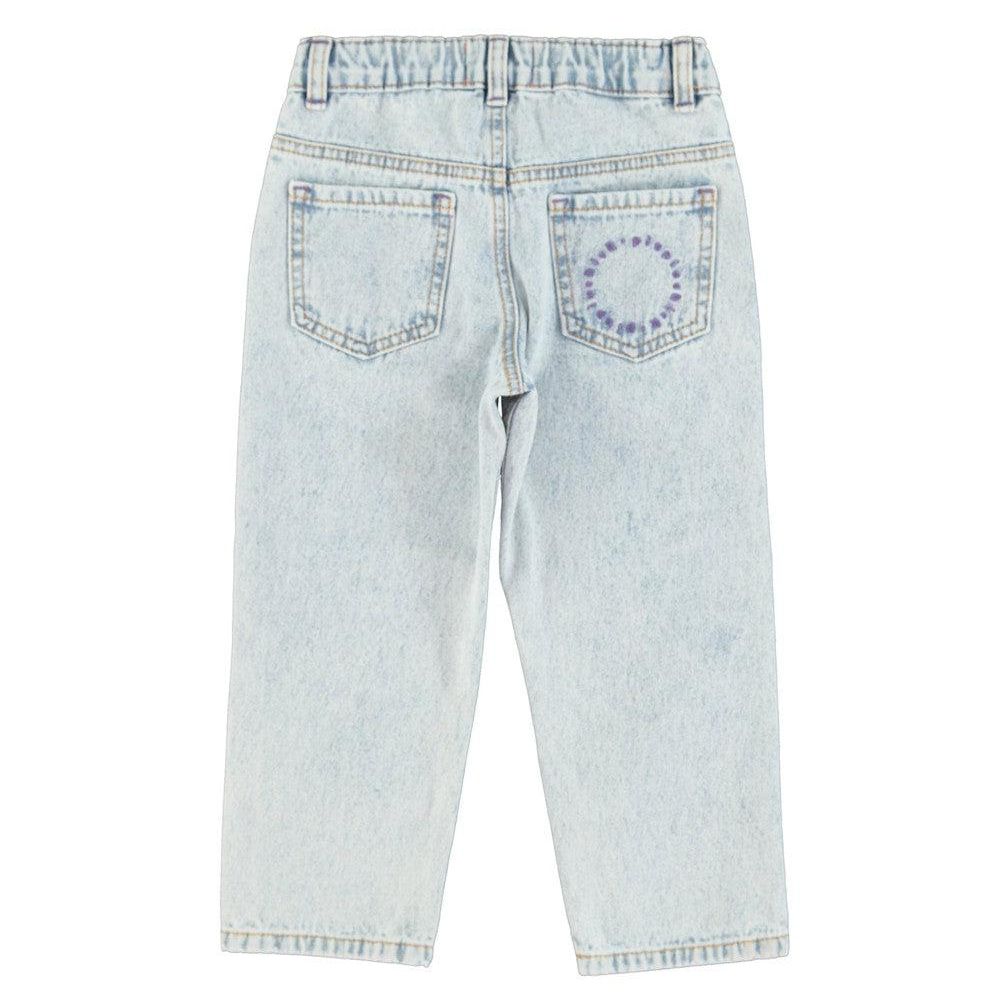 Unisex washed denim trousers with adjustable waist. Detailed with purple logo embroidery in one back pocket.