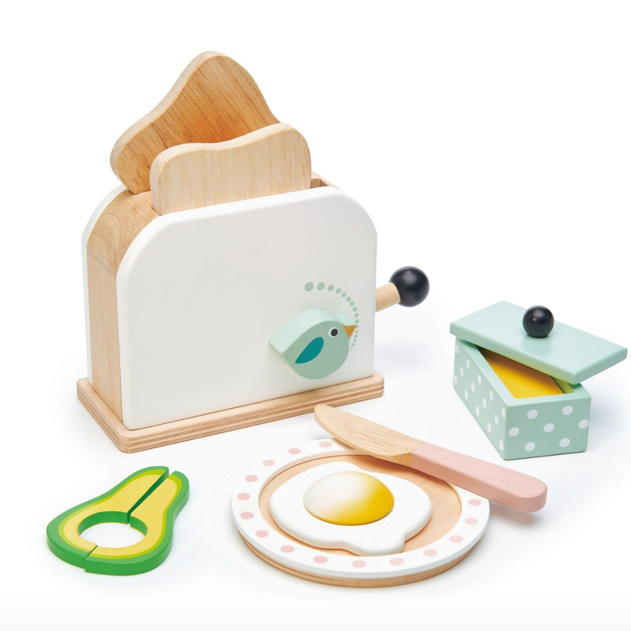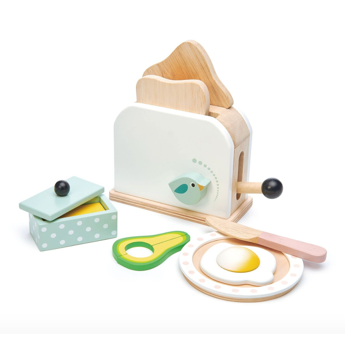 Wie maakt het ontbijt morgenochtend? Een fluitje van een cent met deze mooie houten toaster ontbijt set van Tender Leaf. Rooster 2 sneetjes brood, draai het vogeltje naar de warmste stand, laat de toastjes eruit springen als ze klaar zijn, beboter de toast met het houten mes en bedek met een gepocheerd ei en 2 sneetjes avocado. Mjam! Geschikt voor kinderen vanaf 3 jaar en ouder.