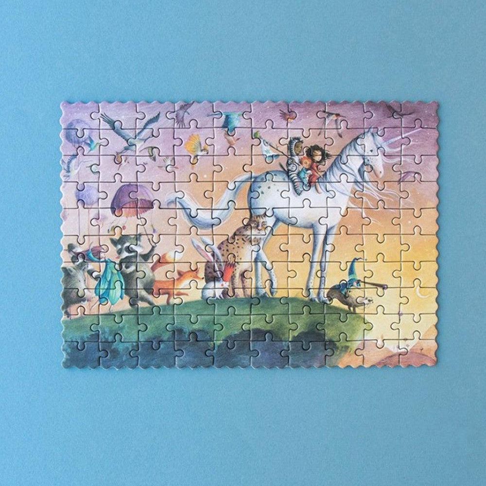Een puzzel van 100 stukjes met een eenhoorn als hoofdpersoon om onze fantasie te laten vliegen naar werelden vol fantasie. Een educatief en duurzaam speelgoed.