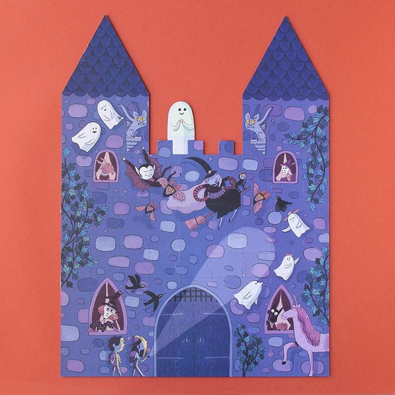 Boe! Wie durft het spookkasteel binnen te gaan? Leg de puzzel in elkaar, doe de lichten uit en.... verrassing!! Spoken gloeien in het donker! Met elk stukje dat we in deze puzzel leggen, ontdekken we dat monsters en spoken niet zo eng zijn. Het zijn vrienden die willen spelen. Angsten onder ogen zien en overwinnen geeft ons het gereedschap om toekomstige uitdagingen met meer zelfvertrouwen aan te gaan.