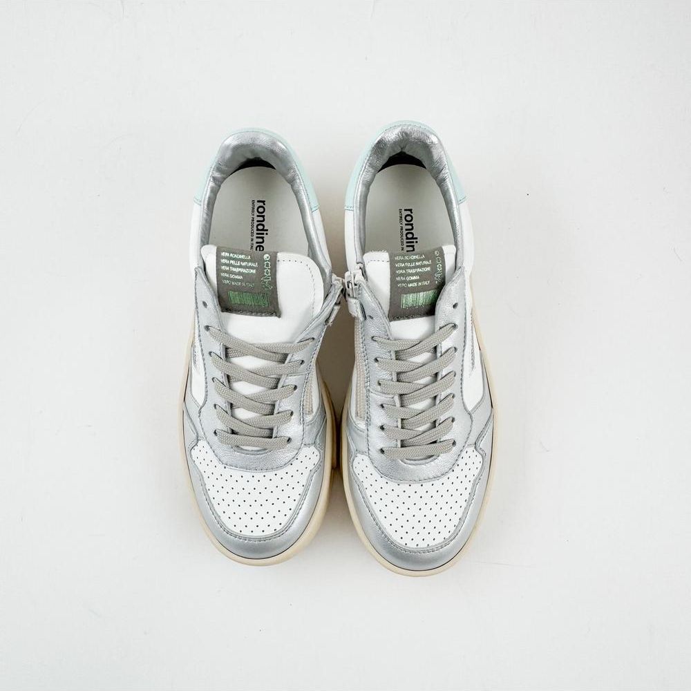 Prachtige sneakers van Rondinella in stijlvol zilver en afgewerkt met lichtblauw detail. De schoen heeft veters en een rits aan de zijkant. Alle schoenen van Rondinella zijn handgemaakt.