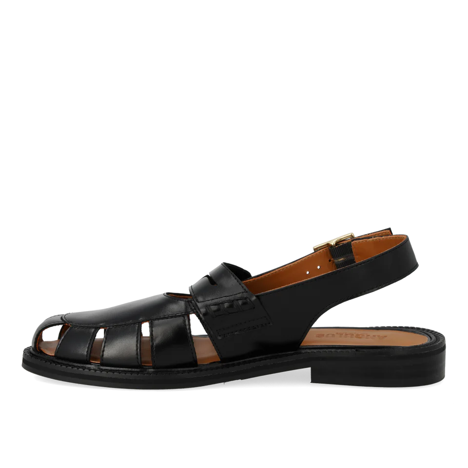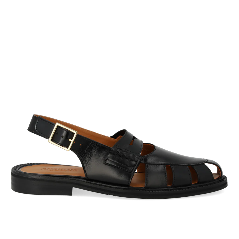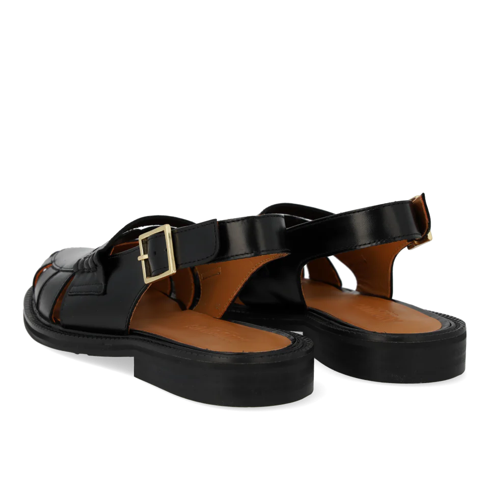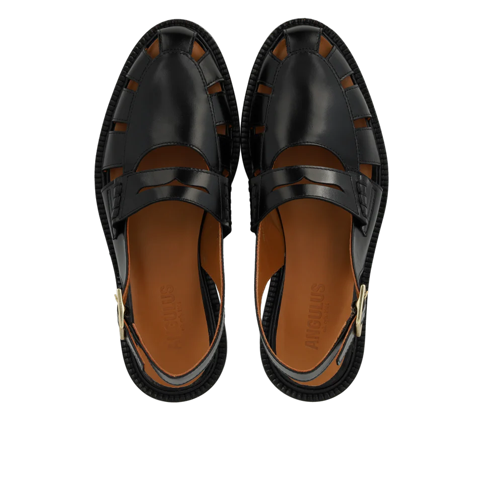 Penny loafer van leer met decoratief uitgesneden patroon en open hiel. De loafer heeft een amandelvormige neus, een verstelbare hielbandsluiting met gouden gesp, een gewatteerde binnenzool, een chroomvrije leren voering en een lichte tunit-zool met decoratieve streep en rubberen buitenzool voor extra comfort en stabiliteit. Gemaakt van natuurlijk en ademend leer. Ontworpen in Denemarken en met liefde handgemaakt in Portugal.