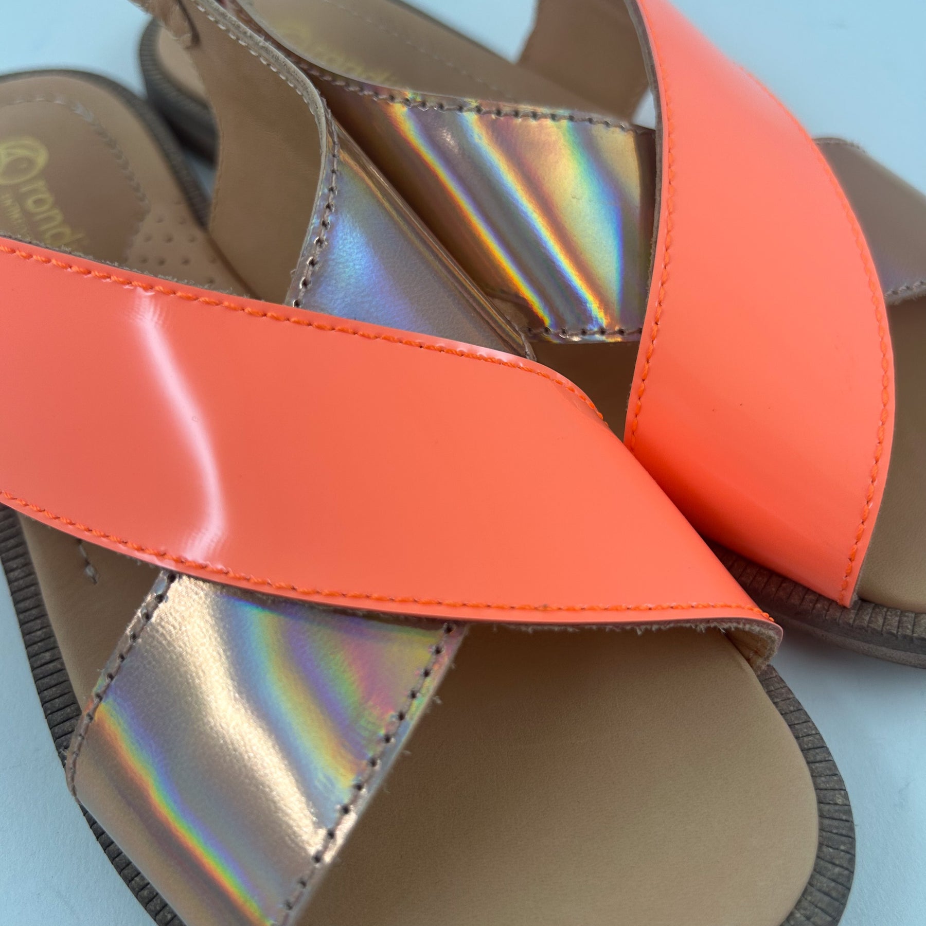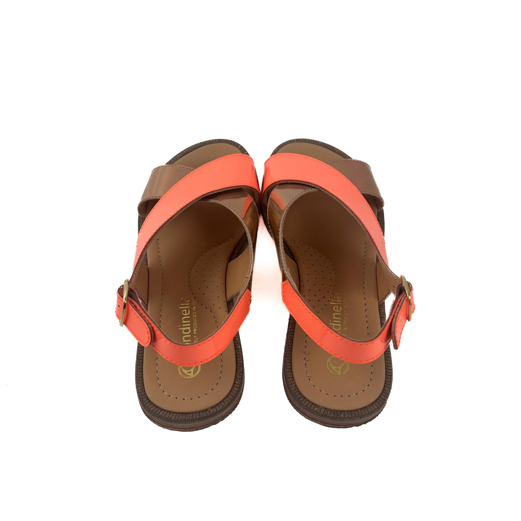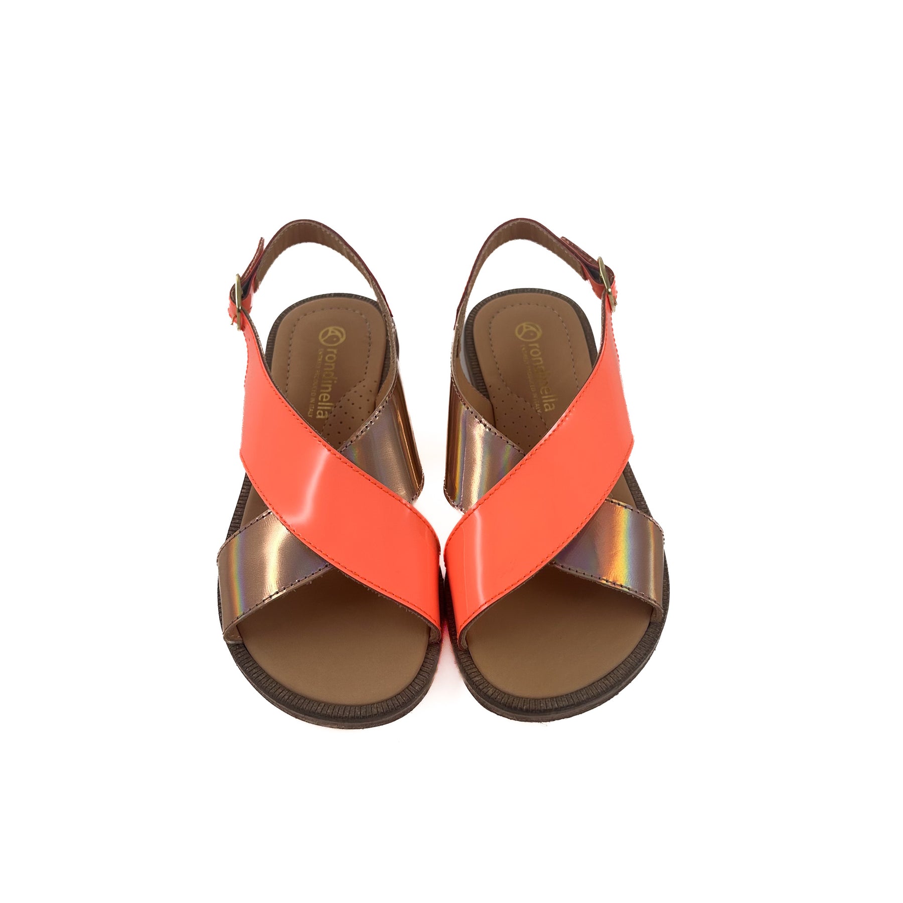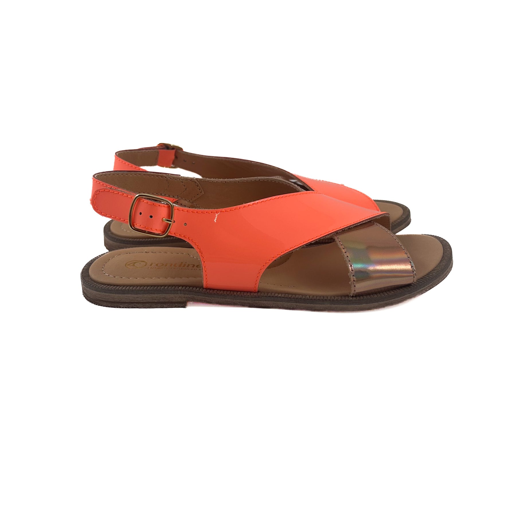 Deze sandaal is een echte eye-catcher. Gemaakt uit roze lakleder en blinkend leder voor een extra touch.