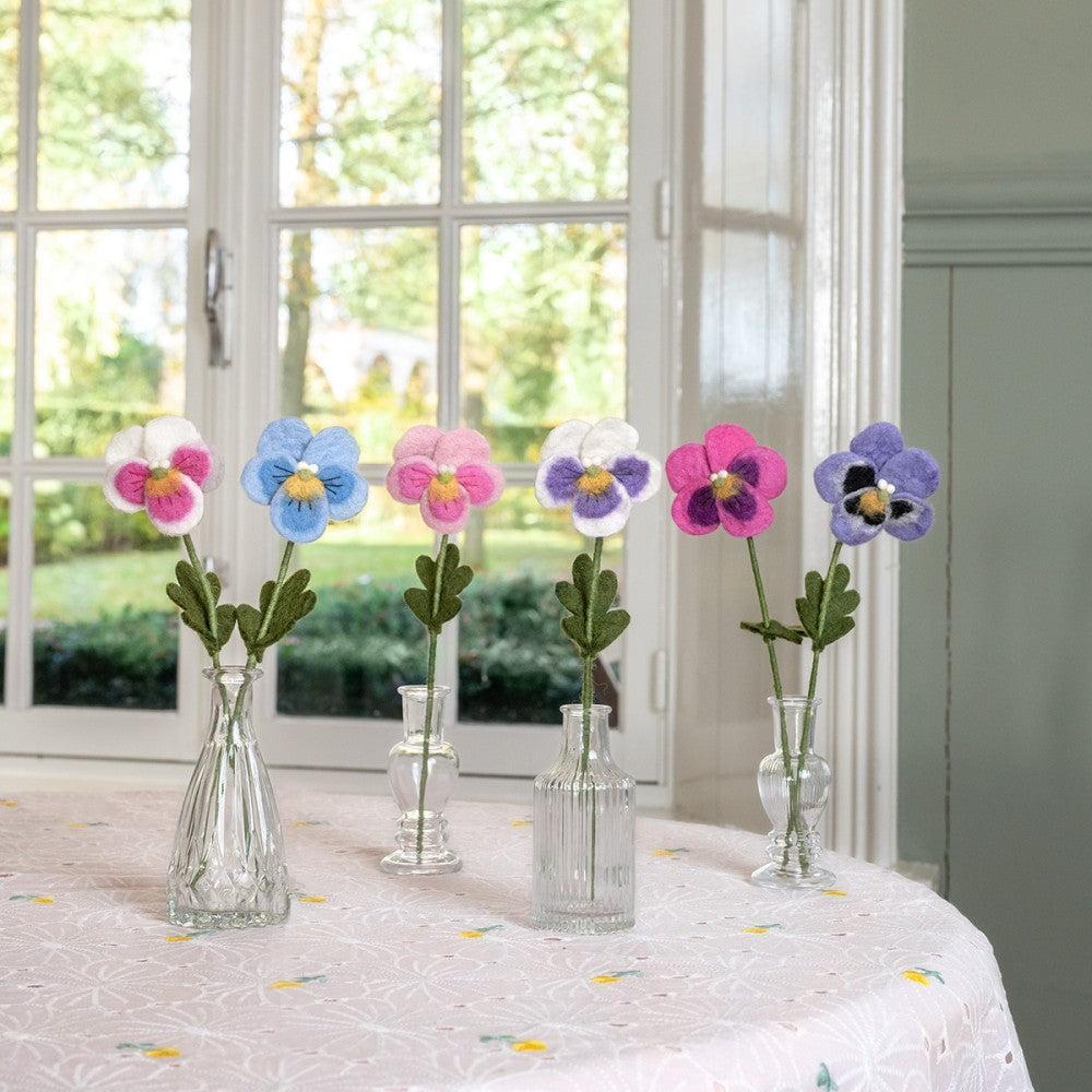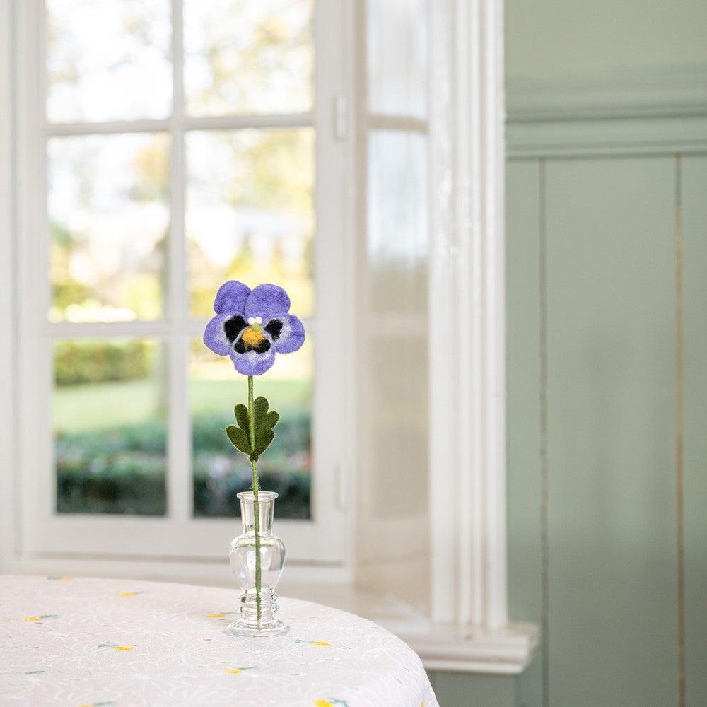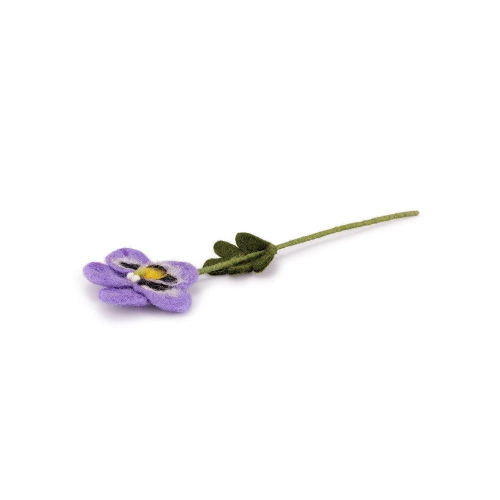 Viooltje in de kleur lila van het delicate merino-wolvilt. In de stengel is metaaldraad verwerkt zodat de bloem in vorm gebogen kan worden indien gewenst. Erg leuk in een vaasje.