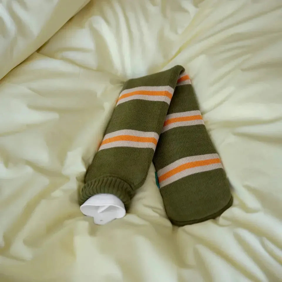 De kruik van natuurlijk latex rubber met gebreid hoesje van biologisch katoen. Het hoesje is heerlijk zacht en kriebelt niet. Met de modieuze kleur samenstellingen past deze kruik niet alleen in bed maar ook op de bank.