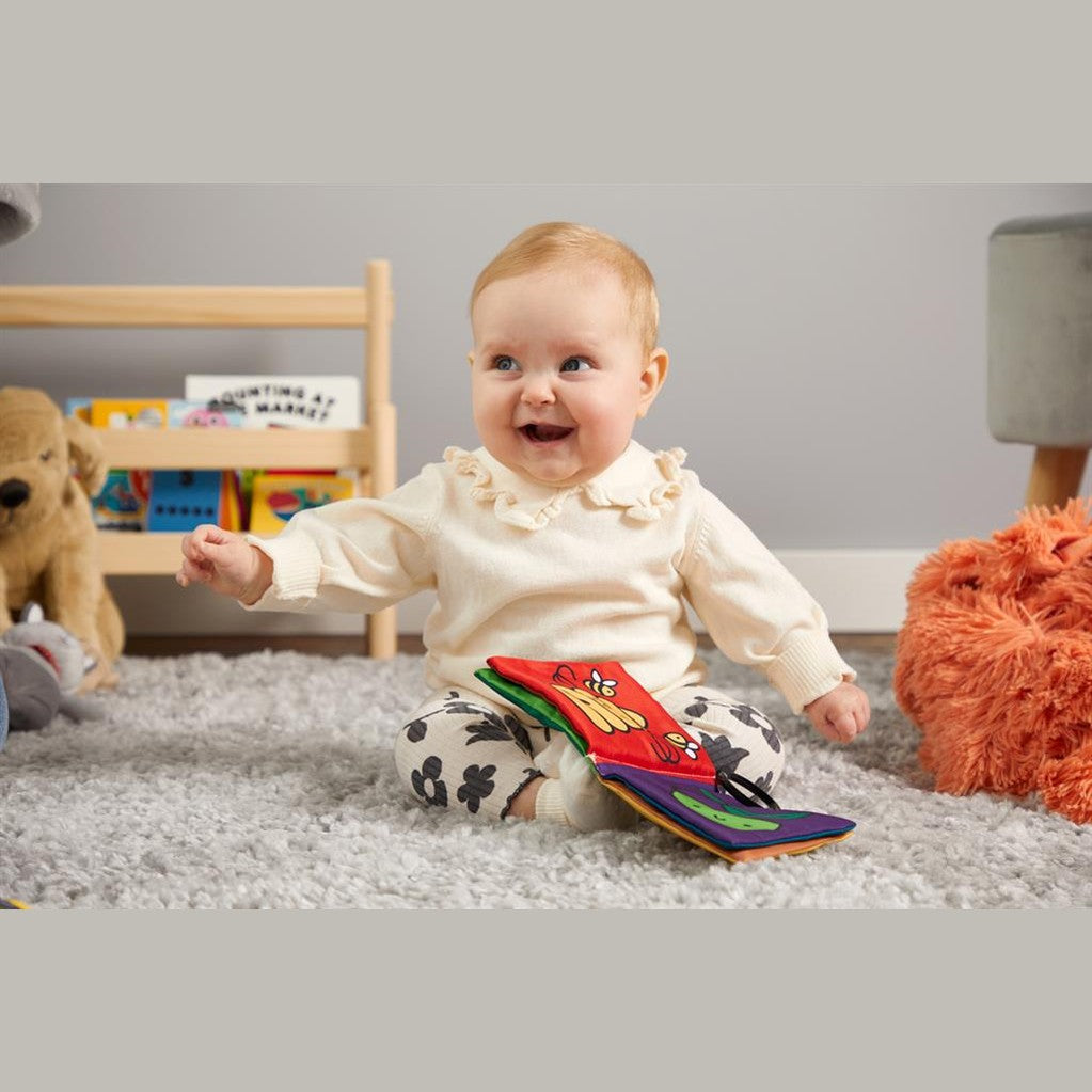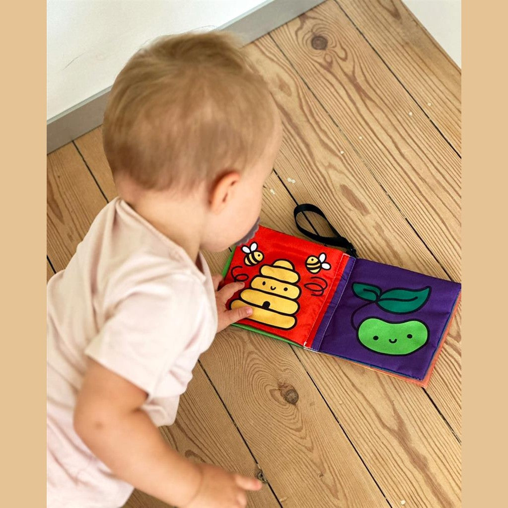 • Zacht stoffen boek dat aan de kinderwagen van je baby kan worden bevestigd