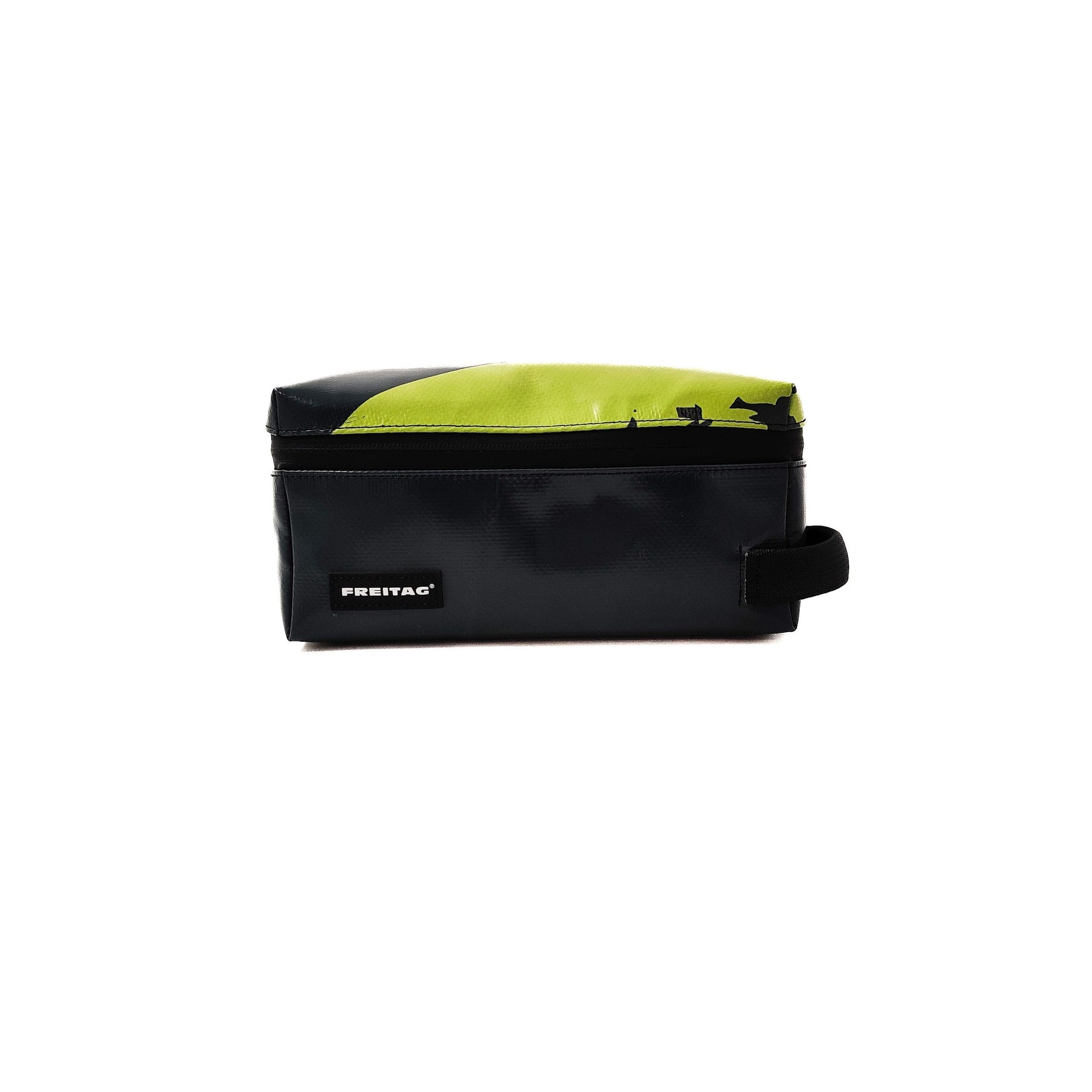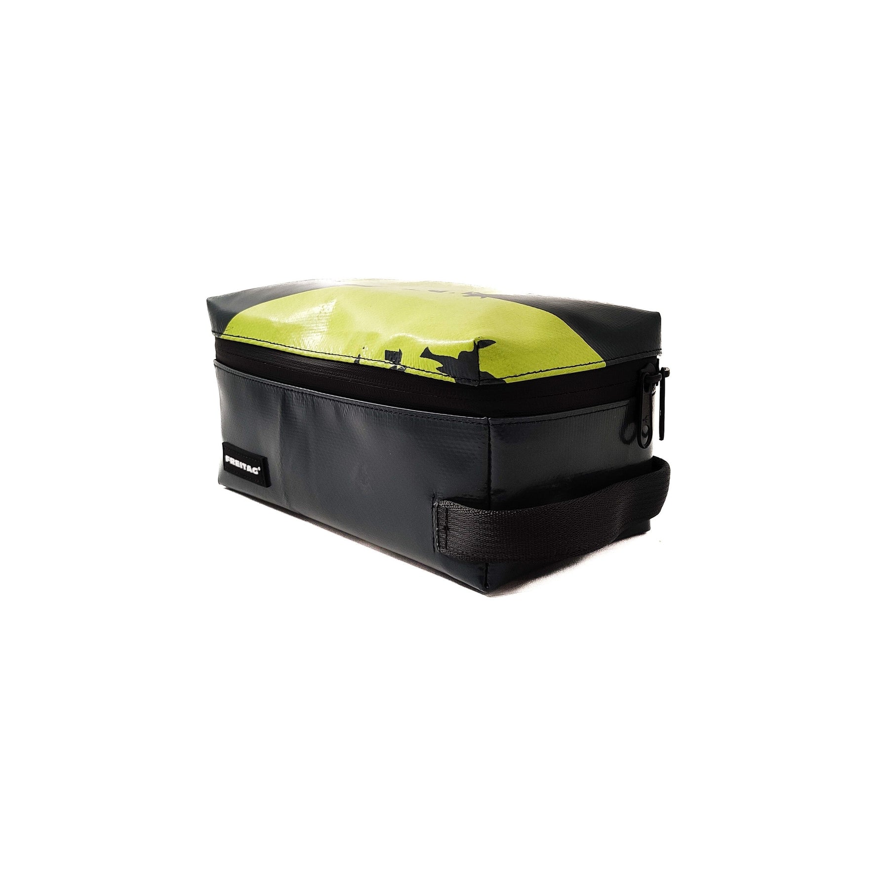 Deze toilettas van FREITAG gemaakt uit gerecycleerd vrachtwagendekzeil is uniek. Er zijn er geen twee zoals deze.  Kijk hier in deze video wat de F36 WAYNE kan. Solid handle. Polished steel inside mirror. Nifty inside pockets.