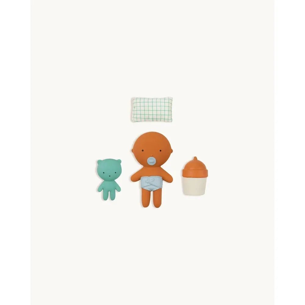 Dit setje van We Are Gommu bevat een mini baby, mini papflesje, mini knuffelbeer en mini kussentje.