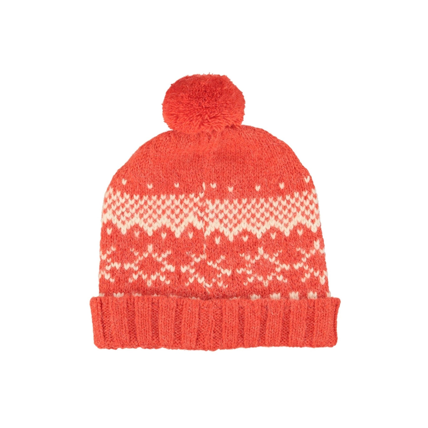 Gebreide muts met jacquarddetail en pompon. Gedetailleerd met leren label.