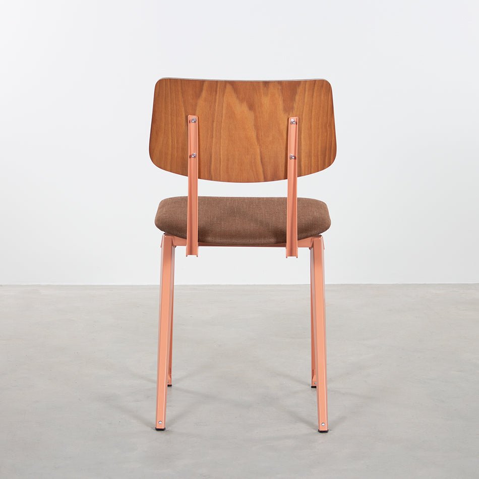De Galvanitas S16 die je kent en liefhebt — maar dan met een extra laag comfort. De gestoffeerde versie in beigerood met bruine houten rugsteun en warme Piquet Brown zitting combineert het tijdloze industriële DNA van de S16 met het comfort van een gestoffeerde zitting. Het zachte bruine weefsel en het terracottarode frame vormen een warme, uitnodigende combinatie die je aan tafel laat blijven — lang na het dessert.