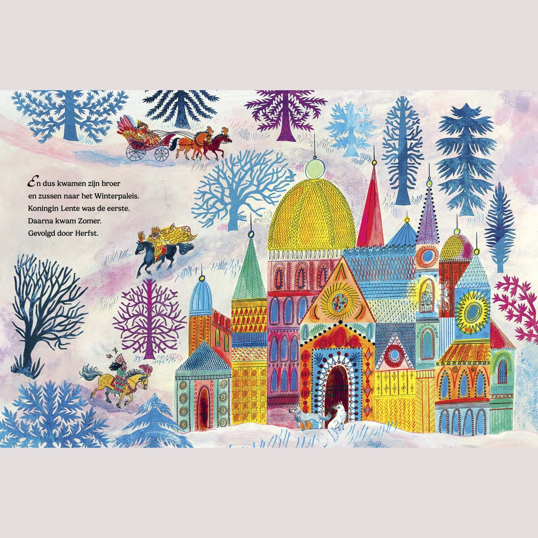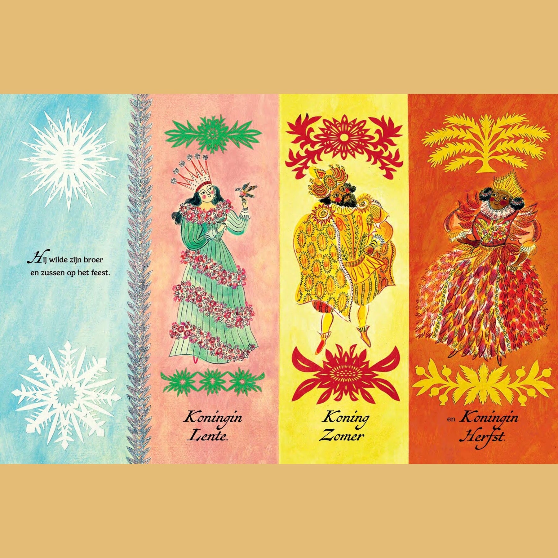 Koning Winter is jarig, en hij wil een écht bijzonder feest. Geen sneeuwpudding of ijstaart dit keer, maar een samenzijn met zijn broer en zussen: Koning Zomer, Koningin Lente en Koningin Herfst. Maar terwijl ze feestvieren in het Winterpaleis, raakt de wereld buiten in de war. De zomerzon schijnt terwijl de herfstregen valt. Lentebloemen bloeien in de sneeuw, dieren weten niet of ze moeten slapen of ontwaken. Alles loopt door elkaar, en de natuur roept: dit moet stoppen.