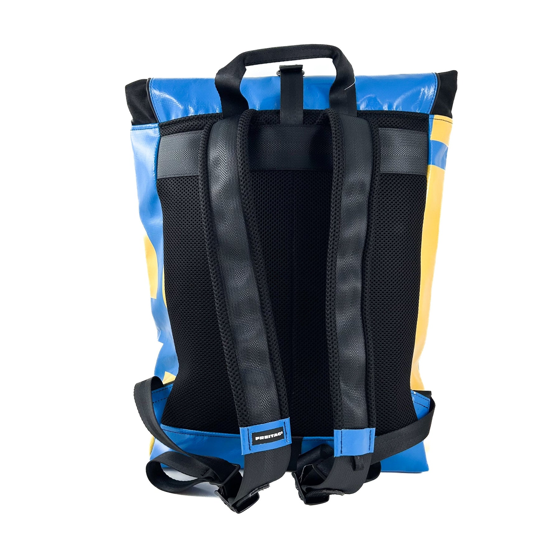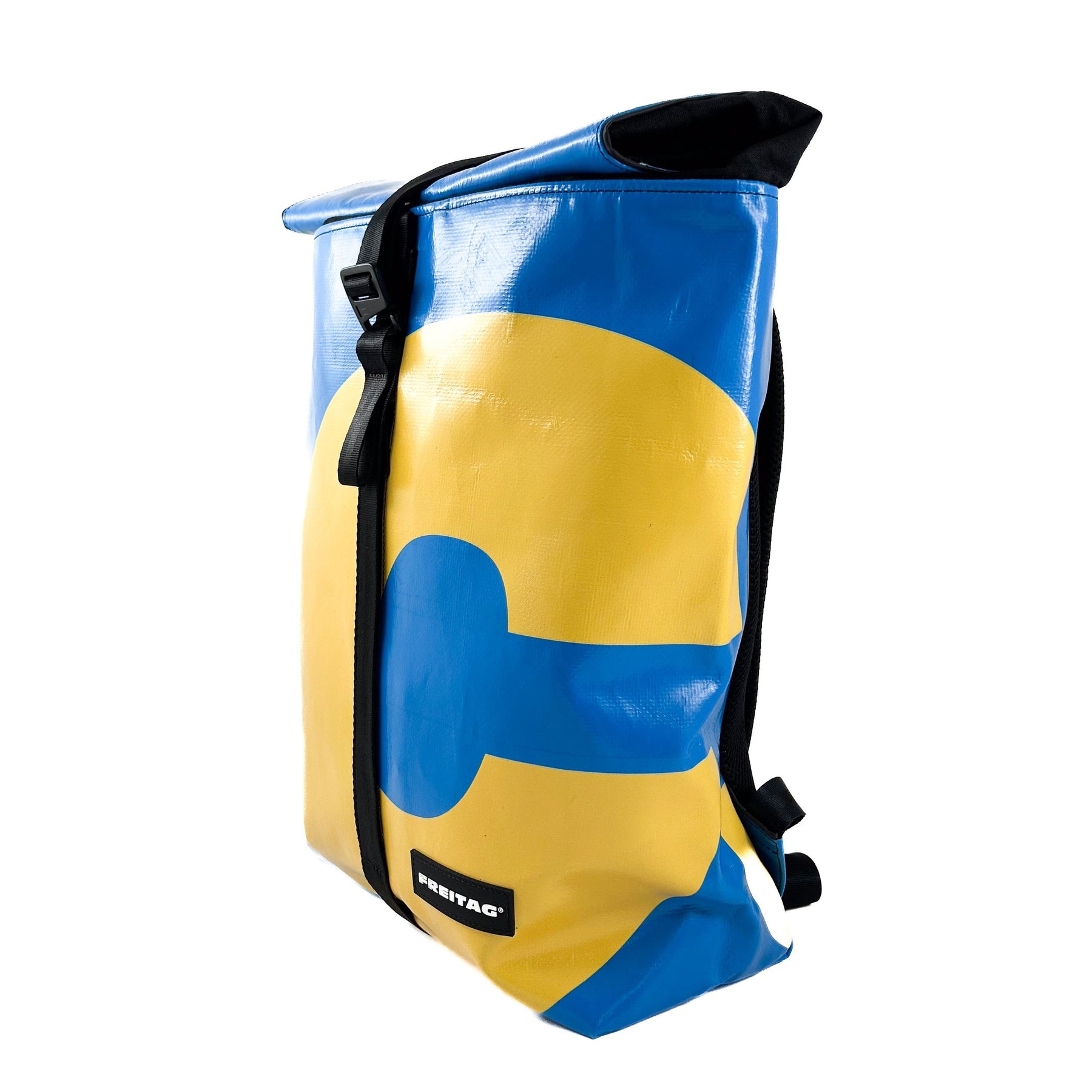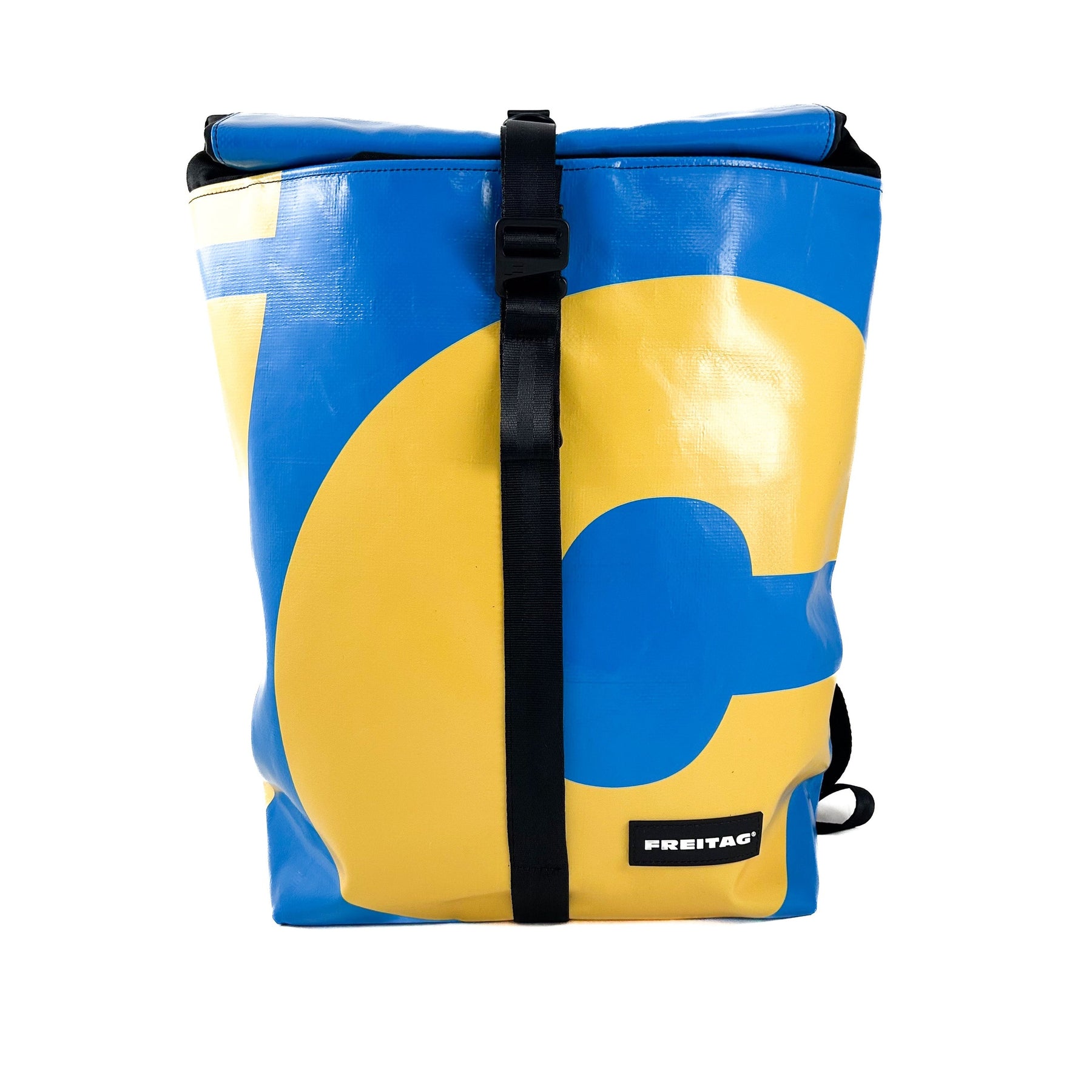 Deze Roll-top rugzak van Freitag gemaakt uit gerecycleerd vrachtwagendekzeil is uniek. Er zijn er geen twee zoals deze.