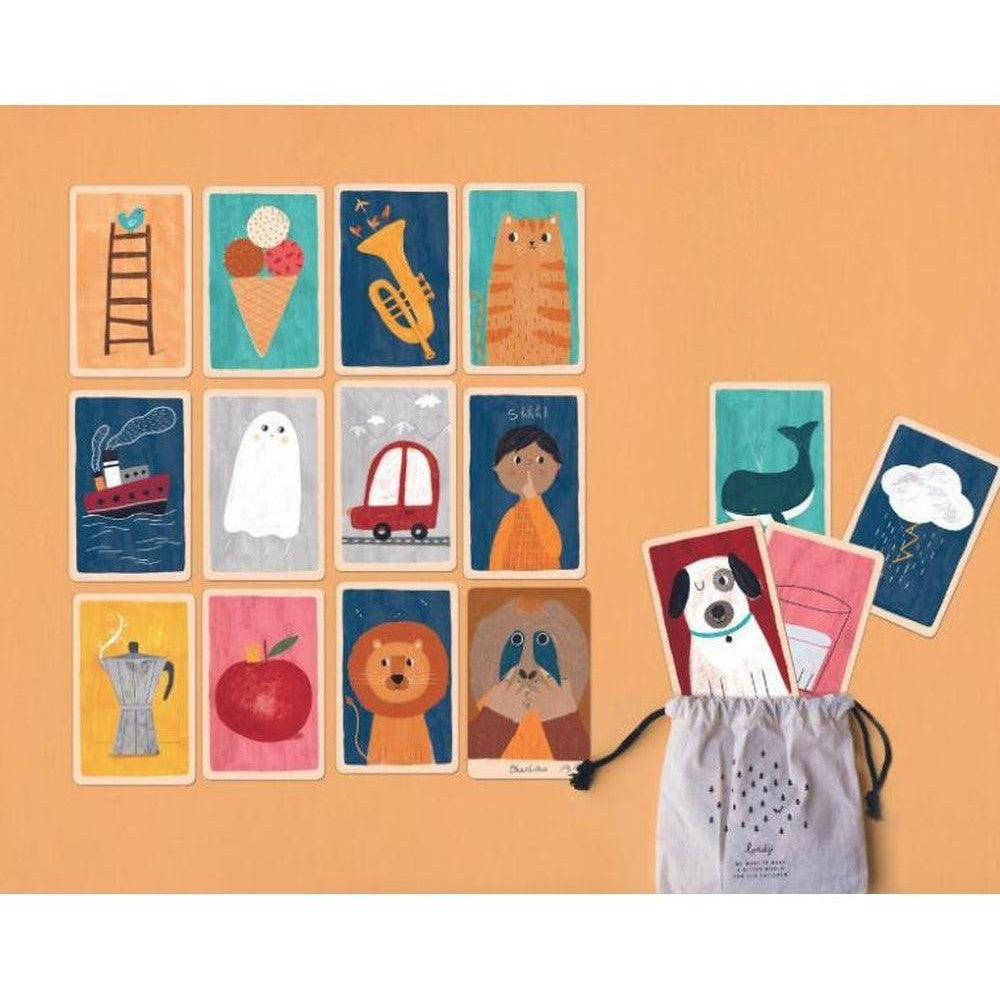 Een spel om samen te spelen en te lachen. Vergelijk het een beetje met ik ga op reis en neem mee. Je moet bij de verschillende kaarten geluiden of gebaren bedenken. Onthoud daarna de geluiden en gebaren die door andere spelers zijn uitgevonden. Het geluid van een orang oetan zal je ook van pas komen. Je kan dit aanpassen aan de leeftijd van de spelers.
