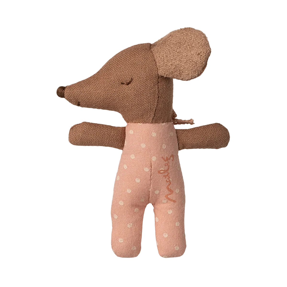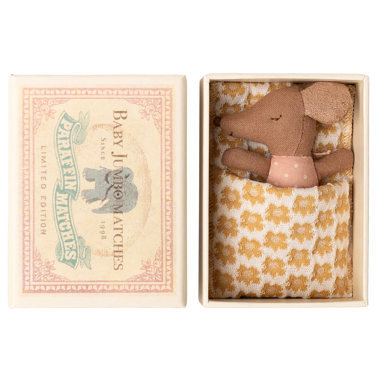 Ah wat zoet! Net geboren en nu in zijn eigen luciferdoosje! Dit lieve babymuisje  heeft aan een kant zijn oogje dicht en de andere kant open. Hij ligt in in een heerlijk  slaapzakje in het lucifer doosjes. (let op dit lucifer doosje heeft weer andere afmetingen dan andere lucifer doosjes van Maileg) A Maileg classic item!