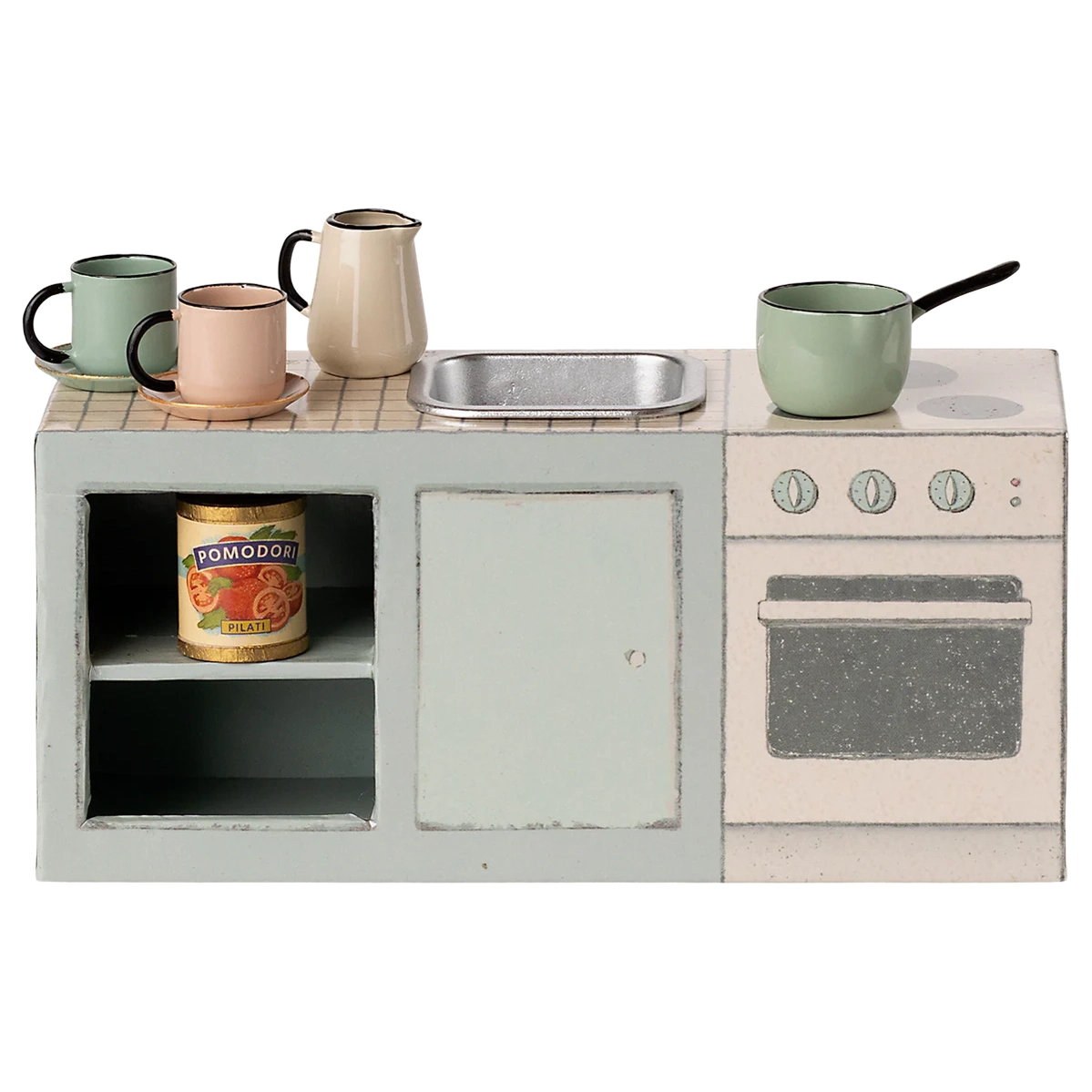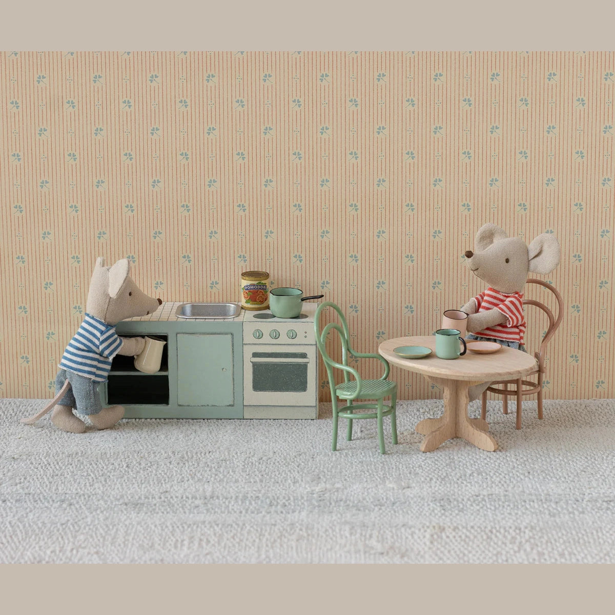 Het kleine aanrechtje wordt geleverd met 2 kopjes en 2 borden, een pan, een kan en een klein blikje. De kleine gootsteen is gemaakt van metaal om er zo echt mogelijk uit te zien. Het past perfect in de keuken van het SuitCasa-muizenhuisje.