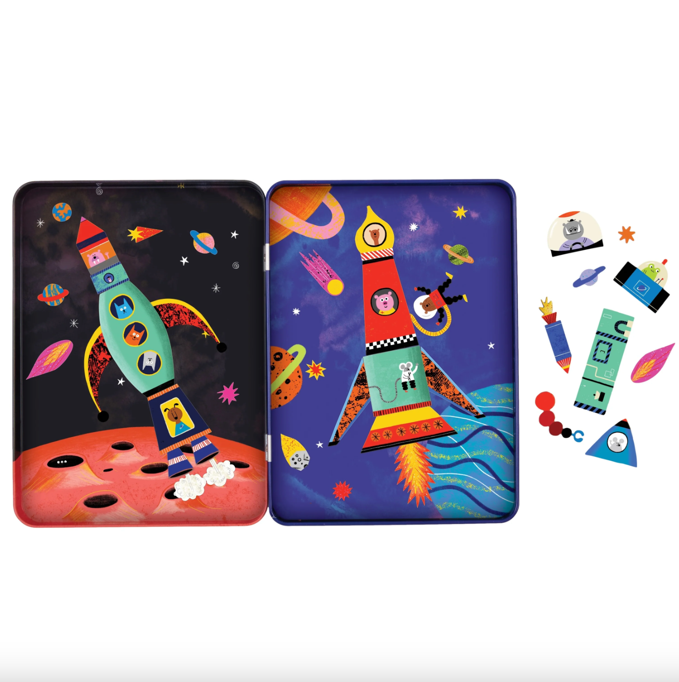 Met de Mudpuppy Ruiteschepen max & match set duiken kinderen in een kleurrijke ruimte met verschillende figuren. Dankzij 2 geïllustreerde achtergronden en 40+ magnetische accessoires zijn de spannende combinaties van plezier eindeloos.