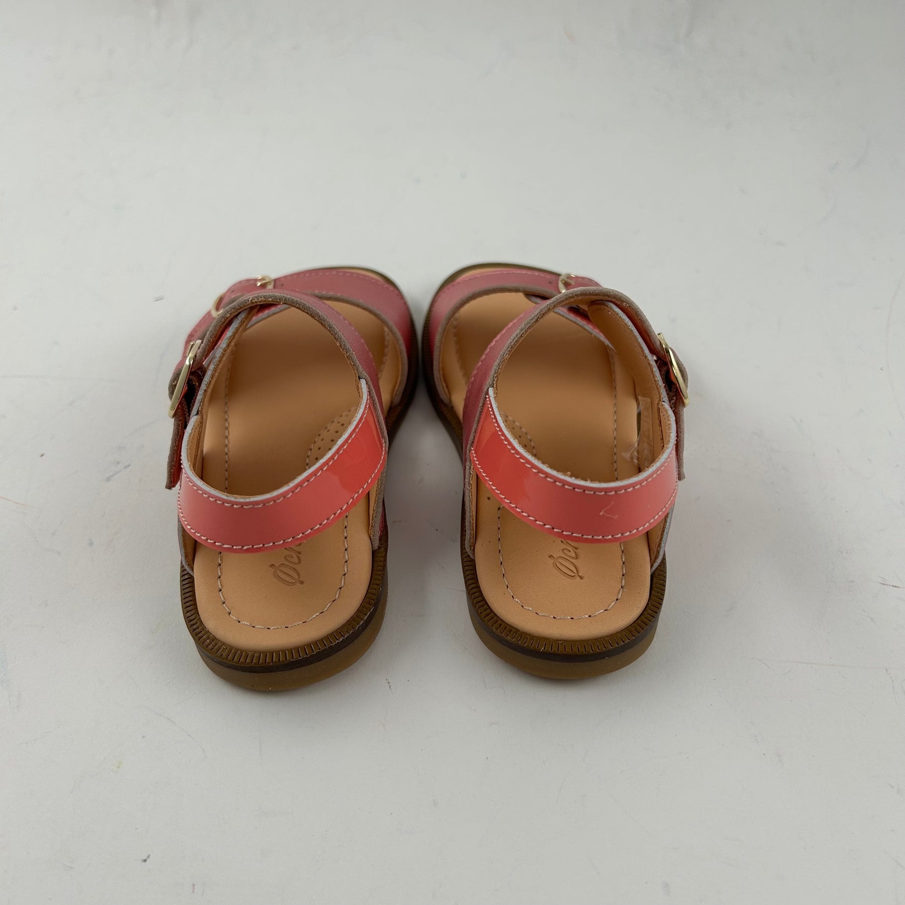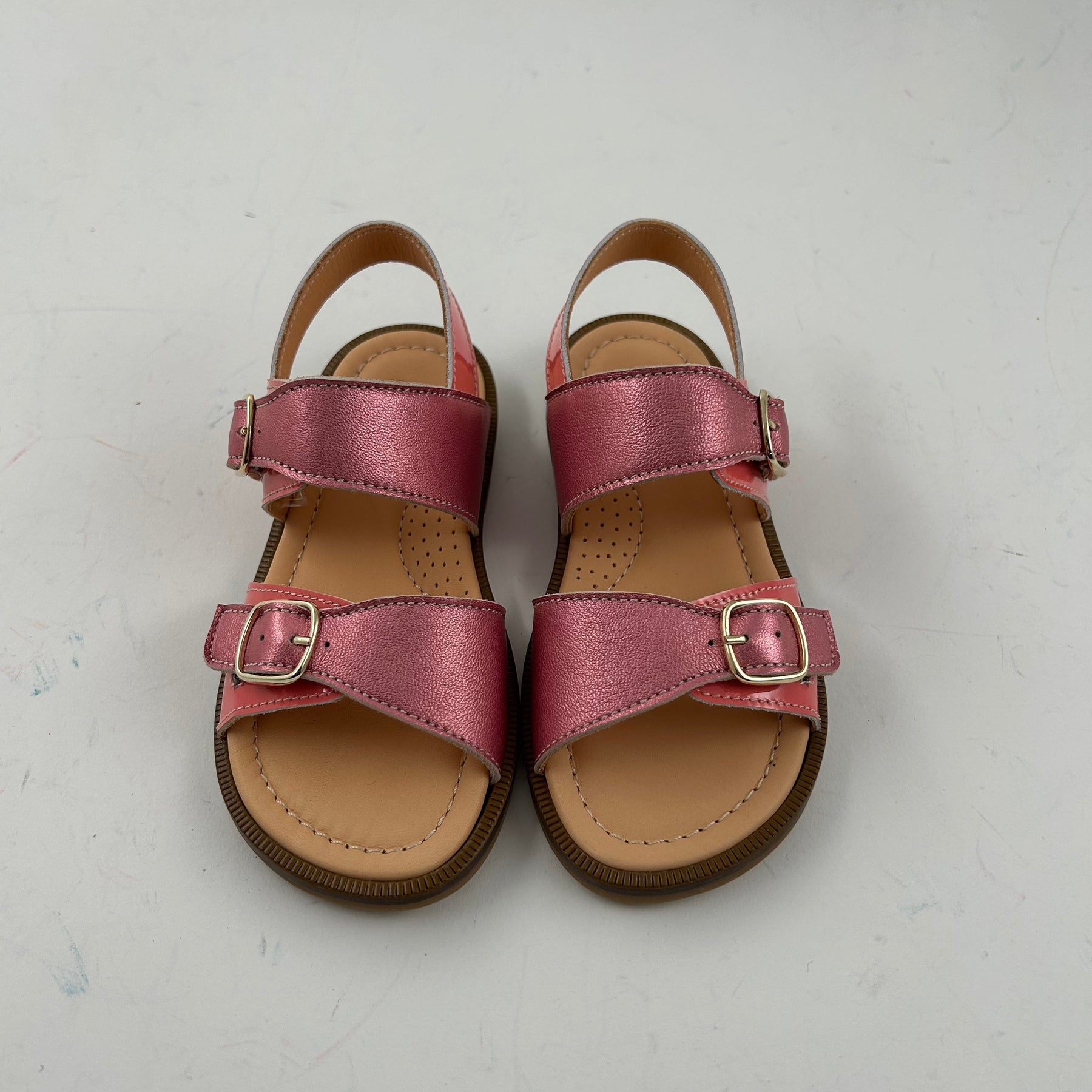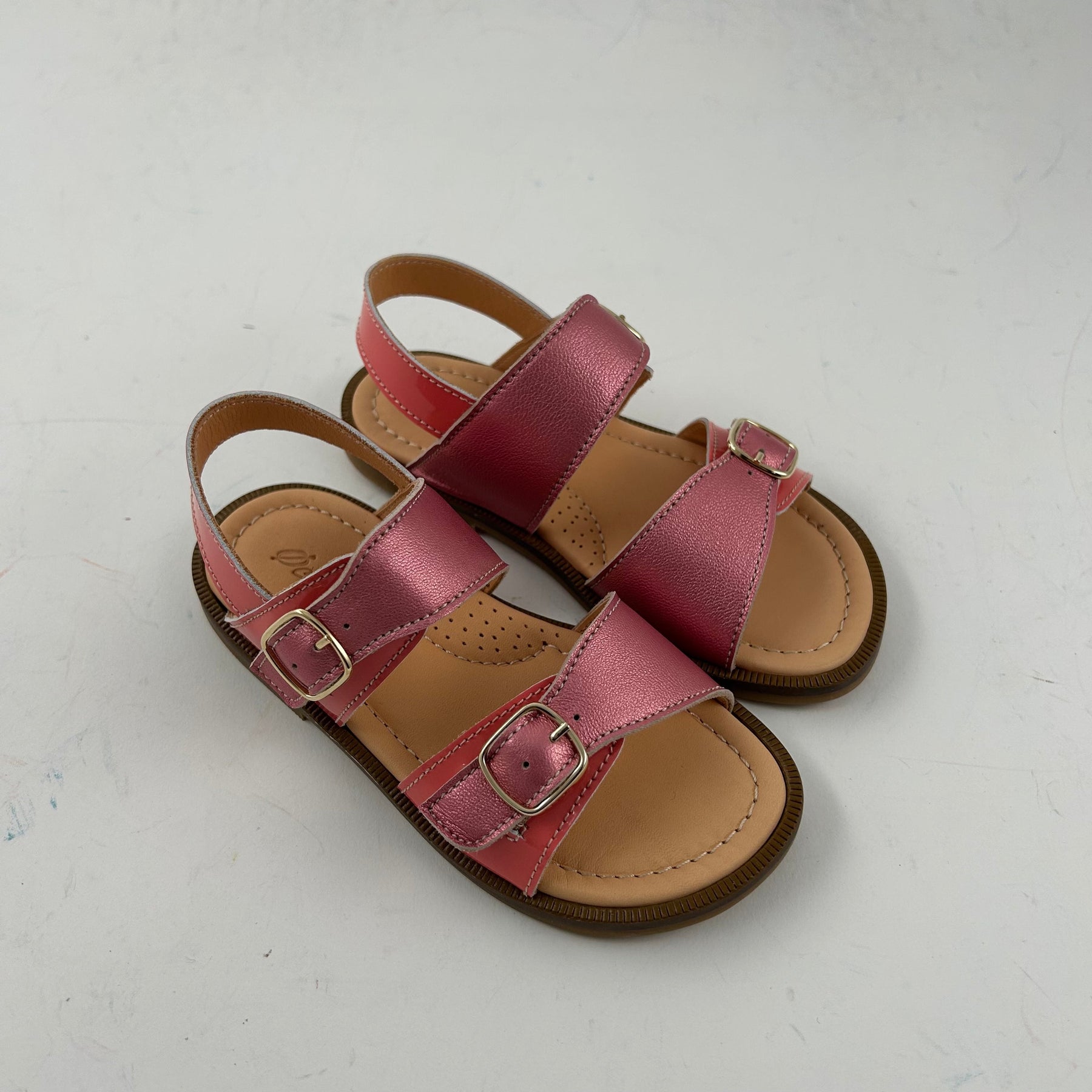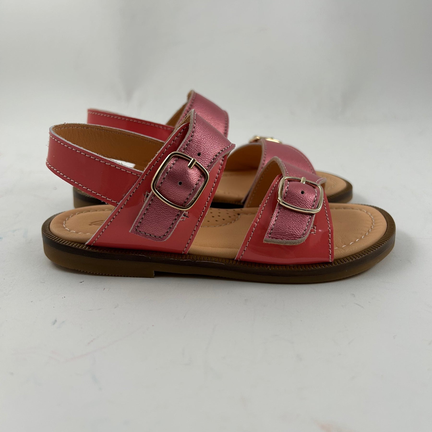 Leuke roze sandaal met gespen vooraan en achteraan. Zodat de sandaal past voor smalle voeten. De schoen is handgemaakt uit lakleder en kalfsleder in roze.