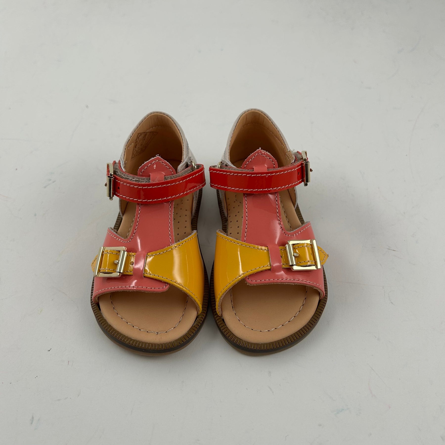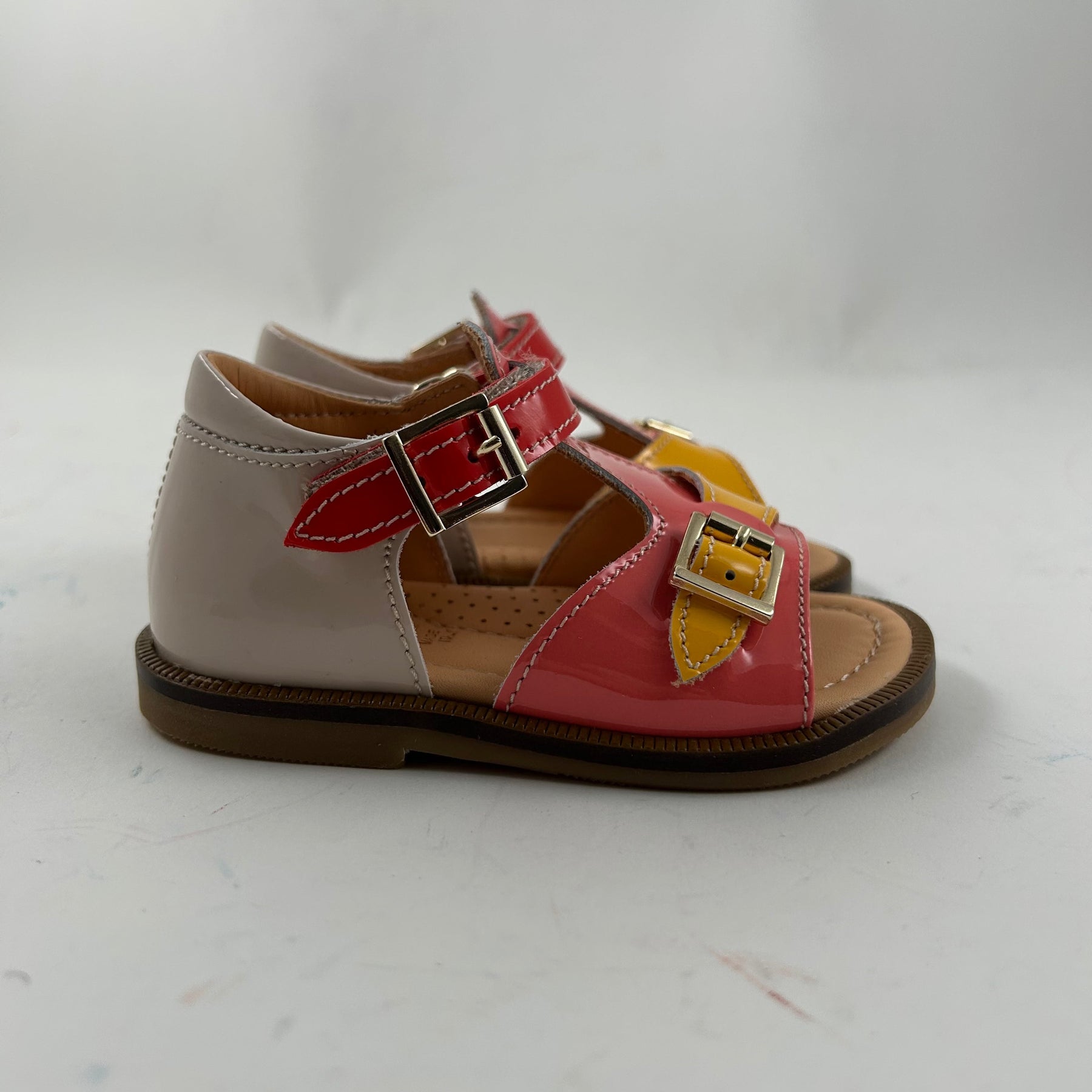 Het hieltje van de schoen is volledig afgesloten. De sandaal heeft een stevige zool. Deze vrolijke sandaal is voortaan aan te passen en heeft klittenband voor bovenaan. Om het af te maken is de schoen volledig handgemaakt in hoogwaardig en kleurrijk lakleder.