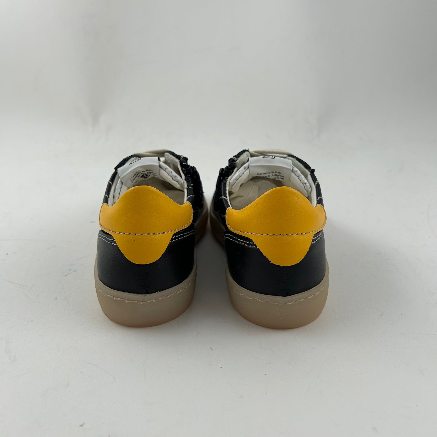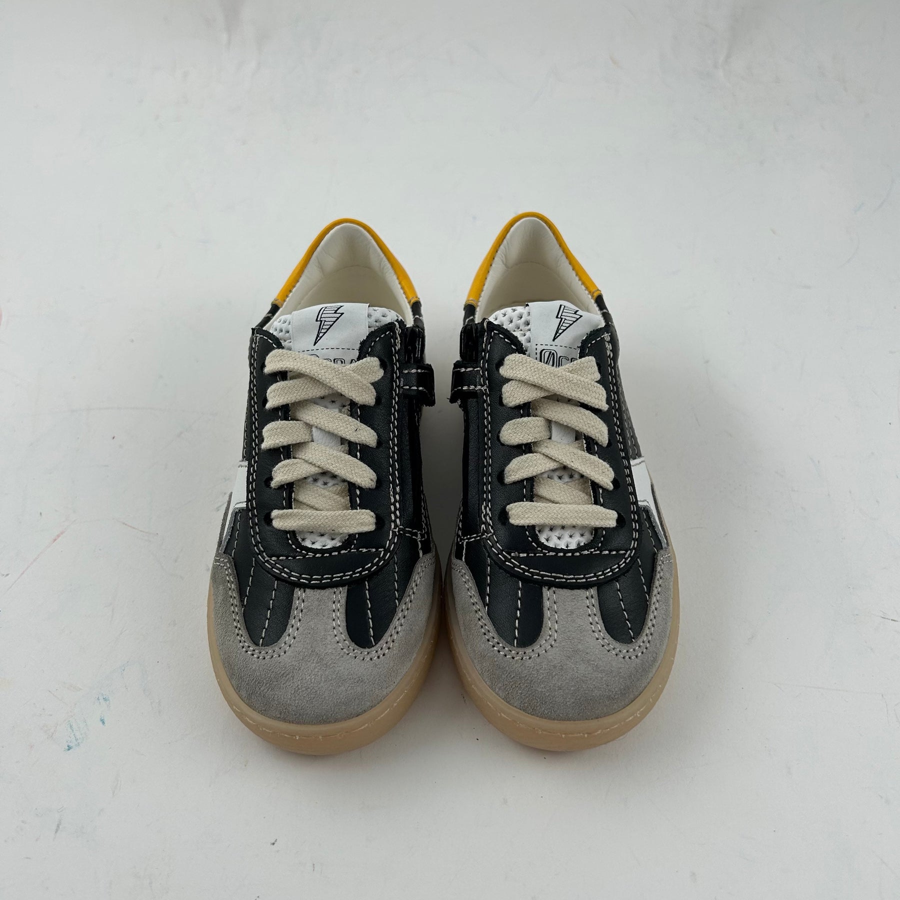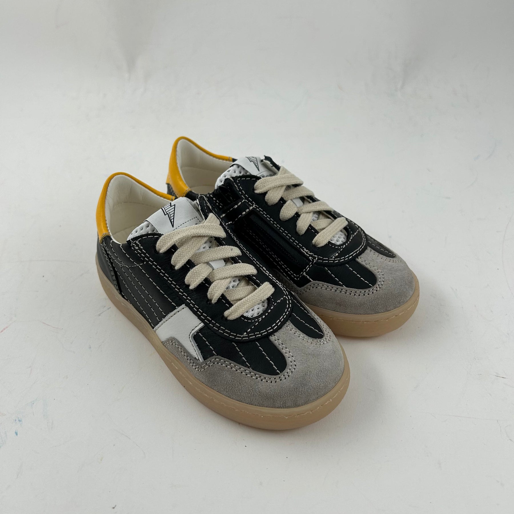 Zoals deze zwarte sneakers. Aan de zijkant hebben ze witte accenten. De tong van de schoen komt in het wit en de achterkant heeft een geel accent. De tip van de schoen is grijs suede. De schoen is volledig gemaakt in kalfsleder en de zool is uitneembaar.