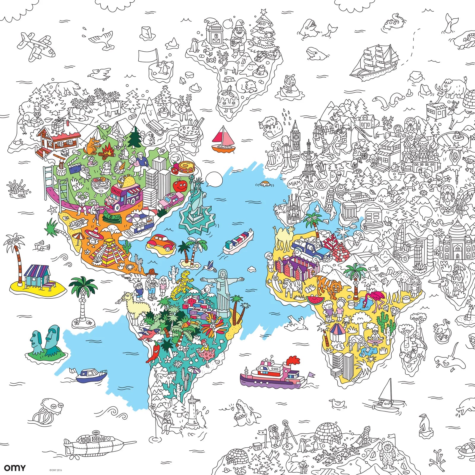 De wereld ontdekken terwijl je plezier hebt: de piramides van Egypte, het Vrijheidsbeeld, Brazilië, de Eskimo's, de beelden van Paaseiland... Een lijn vol humor en een veelheid aan details, een ware grafische reis om te delen tussen alle generaties. Een grenzeloze artistieke ruimte om alleen of met anderen in te kleuren, op de vloer te leggen, aan de muur te hangen of als tafelkleed te gebruiken.