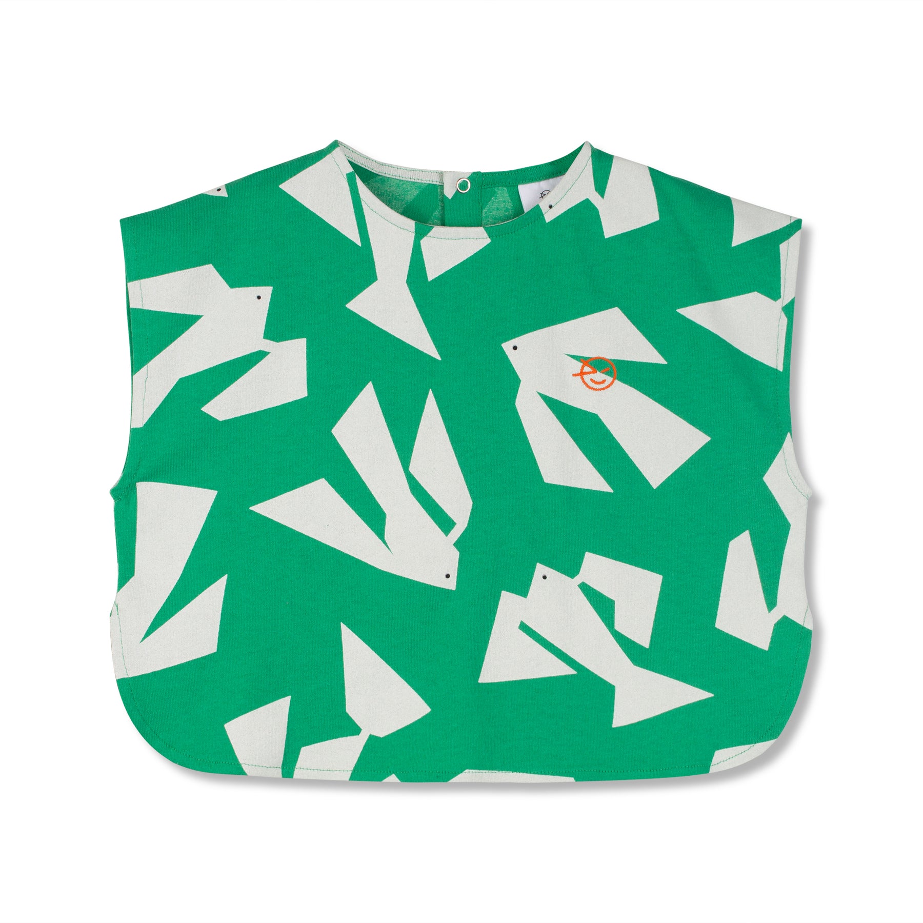 The Sunshine Top is made from soft organic cotton, feeling light and comfy on the skin. Its playful white bird print pops against the parasol green base, while the relaxed boxy fit gives plenty of room to move, twist, and twirl. Side slits with rounded corners add a subtle detail, and two poppers at the back make dressing and changing easy.